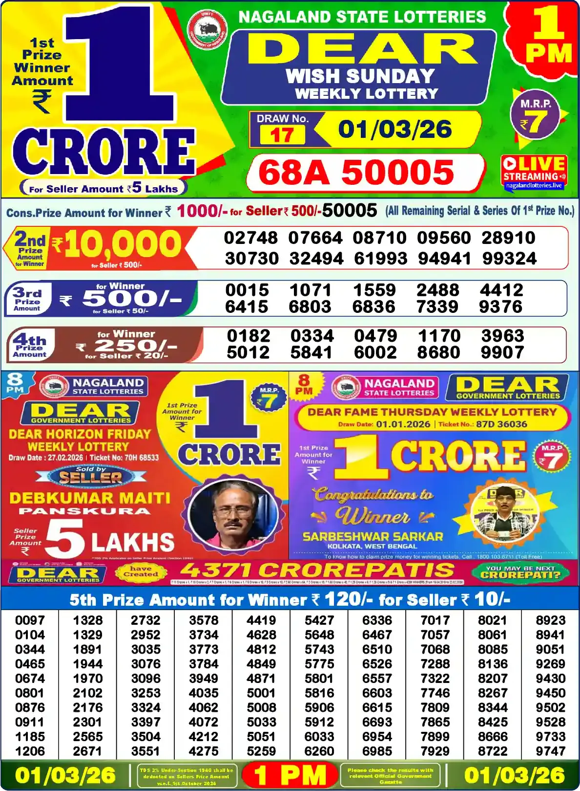 Winning series and full ticket numbers for 1 PM, 6 PM, and 8 PM (IST) draws, with PDF and date-wise archive. Last updated: March 2, 2026, 12:00 AM. If the sheet is slightly delayed, please check again.