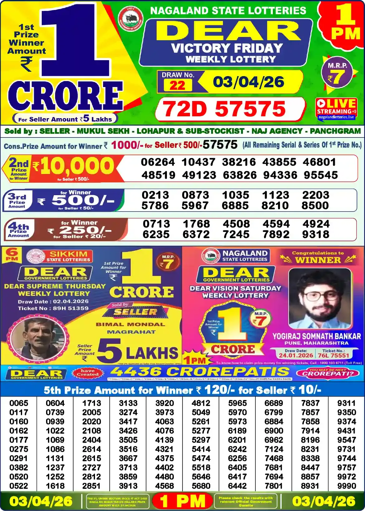 Winning series and full ticket numbers for 1 PM, 6 PM, and 8 PM (IST) draws, with PDF and date-wise archive. Last updated: April 5, 2026, 12:00 AM. If the sheet is slightly delayed, please check again.