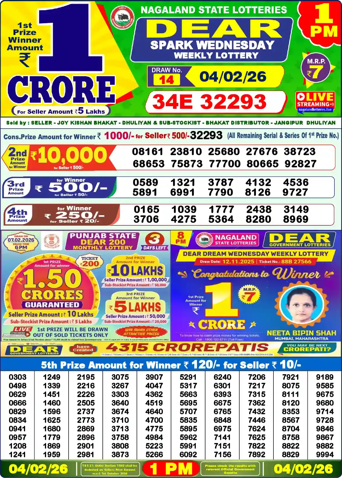 Dear SPARK WEDNESDAY (Draw No. 14) — Official Nagaland State Lotteries (Govt. of Nagaland), Directorate of State Lotteries, Kohima. Draw date: 04.02.2026 at 01:00 PM.