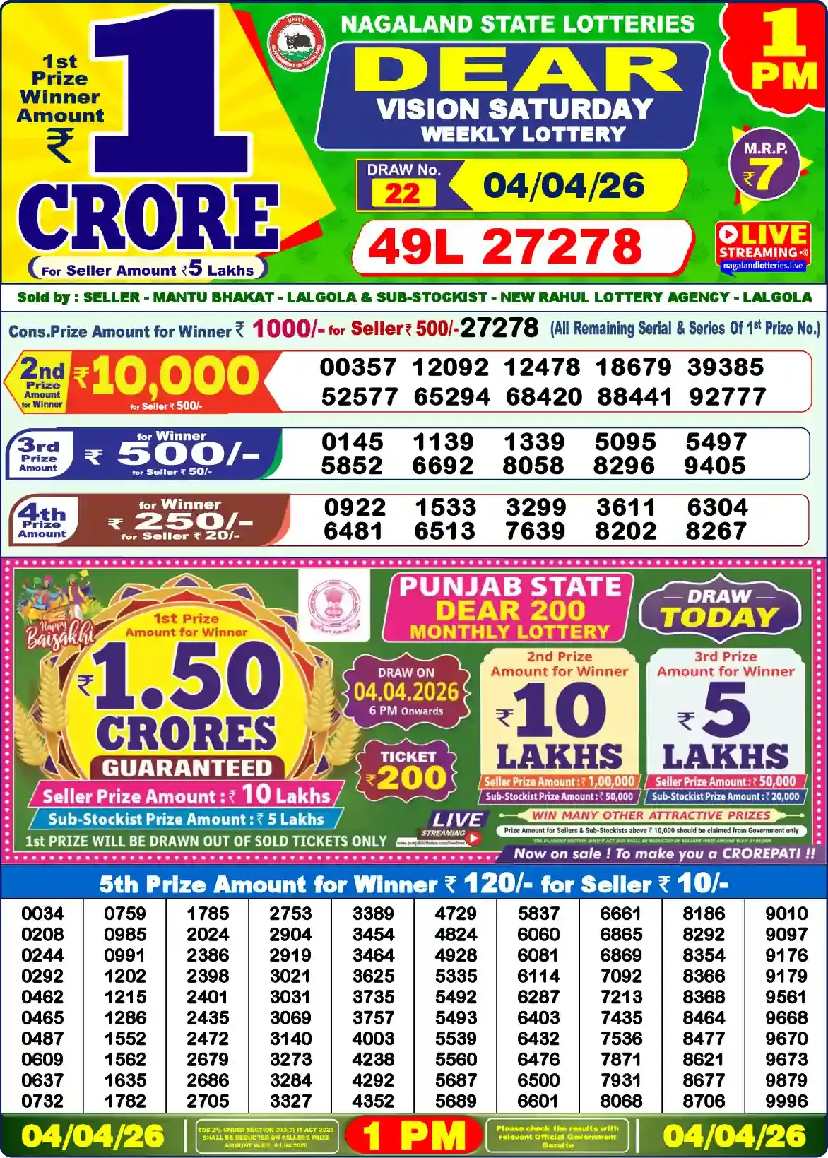 Draw venue: P. R. Hill Junction, Kohima – 797001 under the Director of Nagaland State Lotteries.