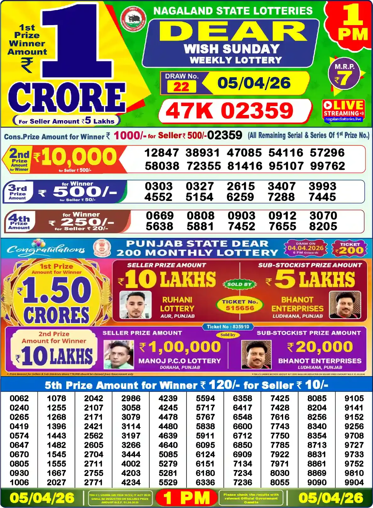 Winning series and full ticket numbers for 1 PM, 6 PM, and 8 PM (IST) draws, with PDF and date-wise archive. Last updated: April 6, 2026, 12:00 AM. If the sheet is slightly delayed, please check again.