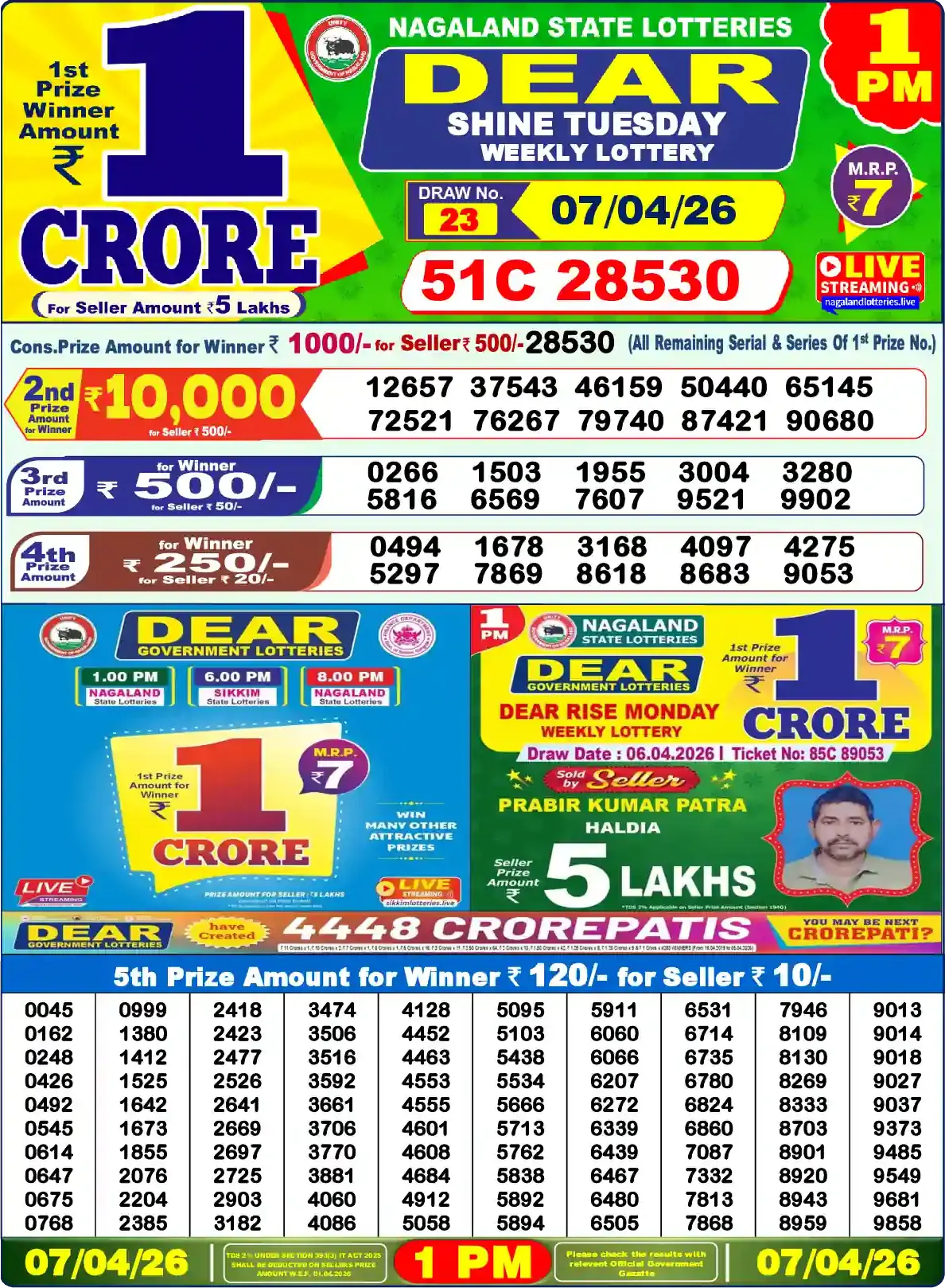 Dear DESTINY TUESDAY (Draw No. 23) — Official Nagaland State Lotteries (Govt. of Nagaland), Directorate of State Lotteries, Kohima. Draw date: 07.04.2026 at 08:00 PM.