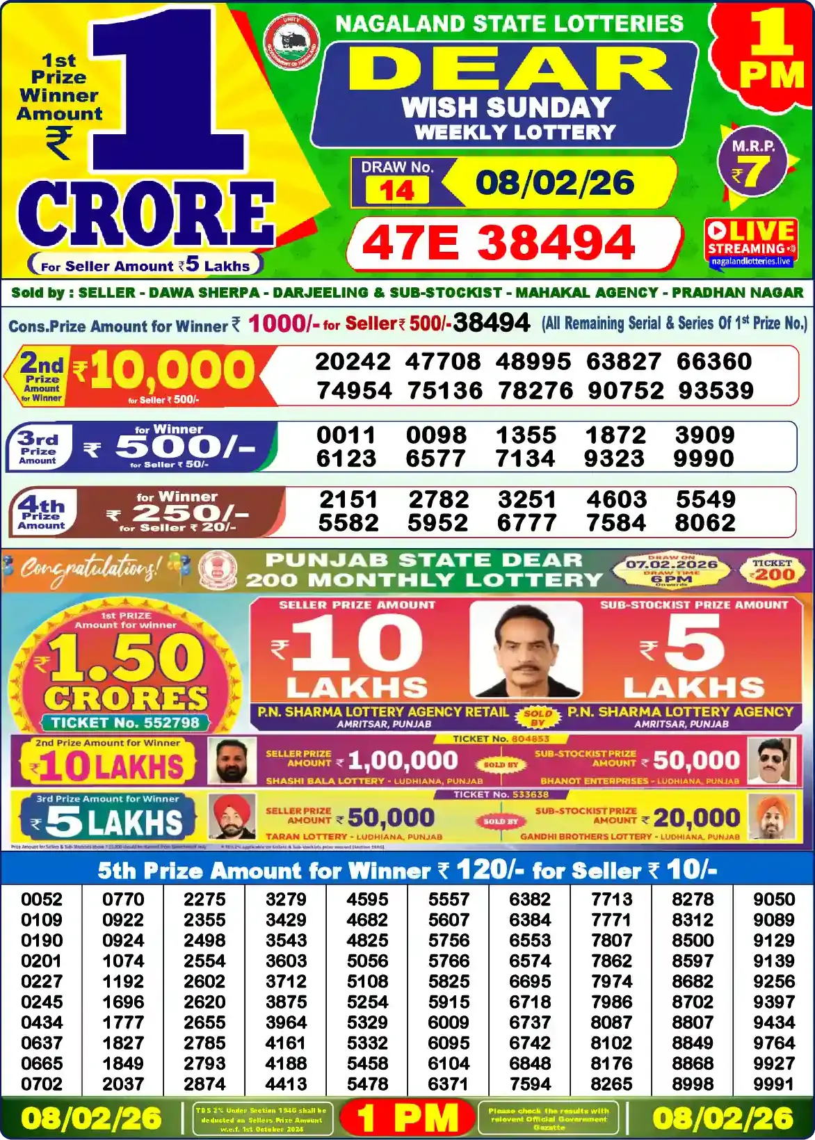Winning series and full ticket numbers for 1 PM, 6 PM, and 8 PM (IST) draws, with PDF and date-wise archive. Last updated: February 8, 2026, 12:00 AM. If the sheet is slightly delayed, please check again.