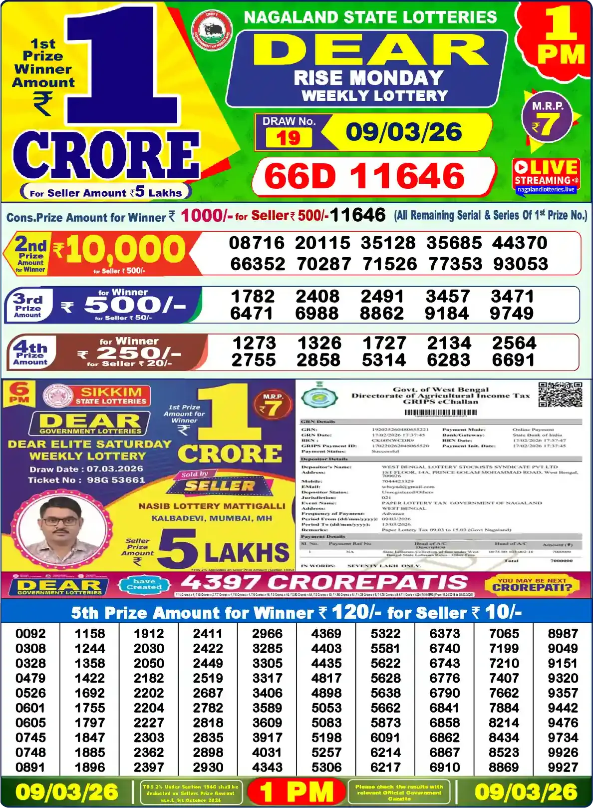Dear LEGEND MONDAY (Draw No. 23) — Government of Sikkim Directorate of State Lotteries, Gangtok. Draw date: 09.03.2026 at 06:00 PM.