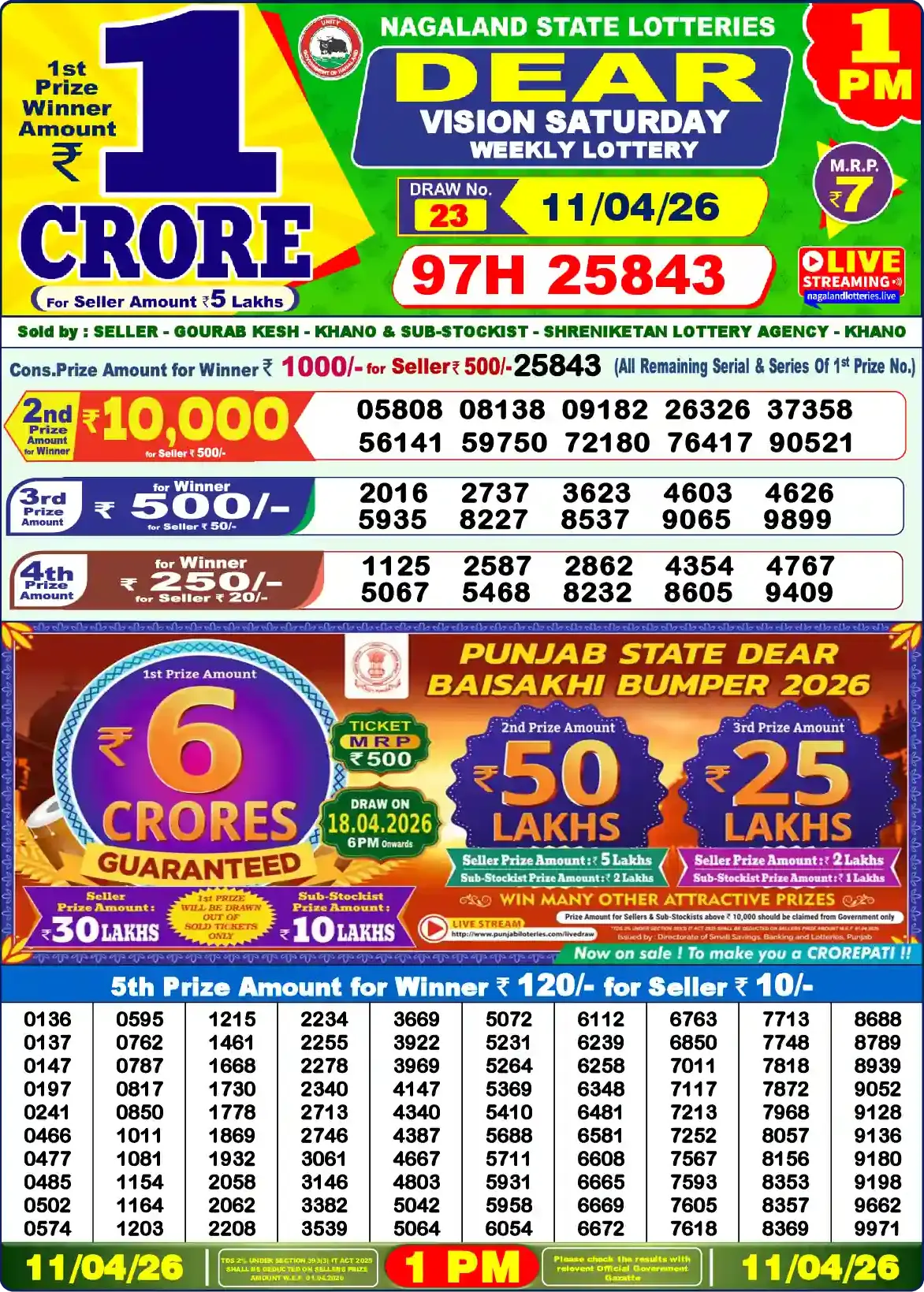 Dear VISION SATURDAY (Draw No. 23) — Official Nagaland State Lotteries (Govt. of Nagaland), Directorate of State Lotteries, Kohima. Draw date: 11.04.2026 at 01:00 PM.