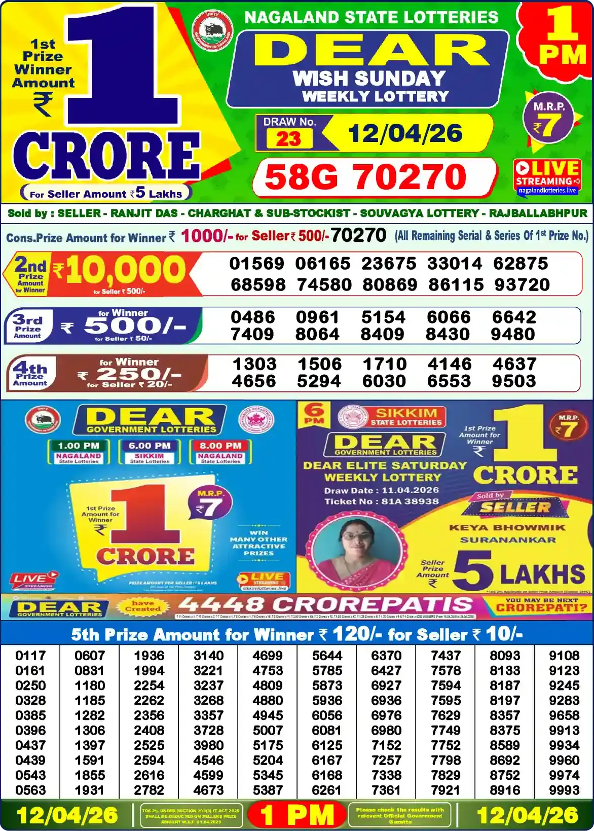 Winning series and full ticket numbers for 1 PM, 6 PM, and 8 PM (IST) draws, with PDF and date-wise archive. Last updated: April 13, 2026, 12:00 AM. If the sheet is slightly delayed, please check again.