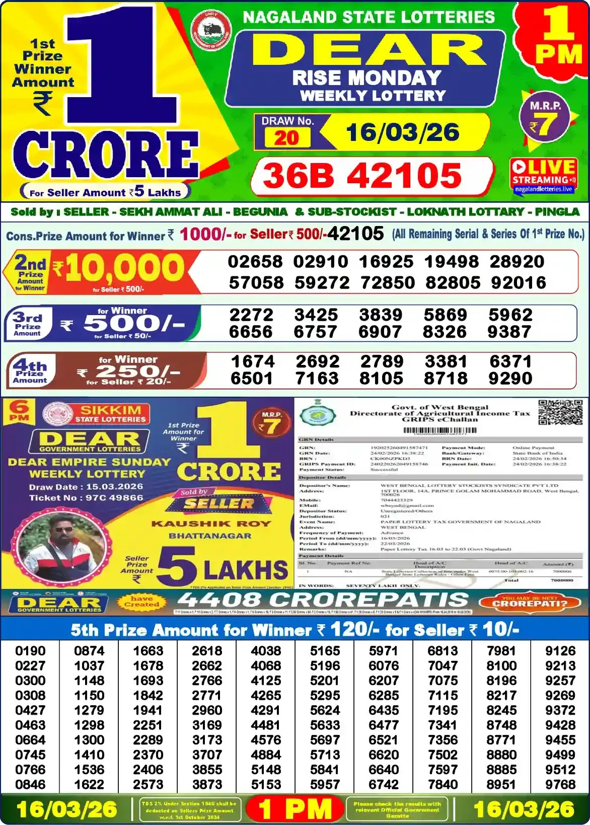 Winning series and full ticket numbers for 1 PM, 6 PM, and 8 PM (IST) draws, with PDF and date-wise archive. Last updated: March 16, 2026, 8:09 PM. If the sheet is slightly delayed, please check again.