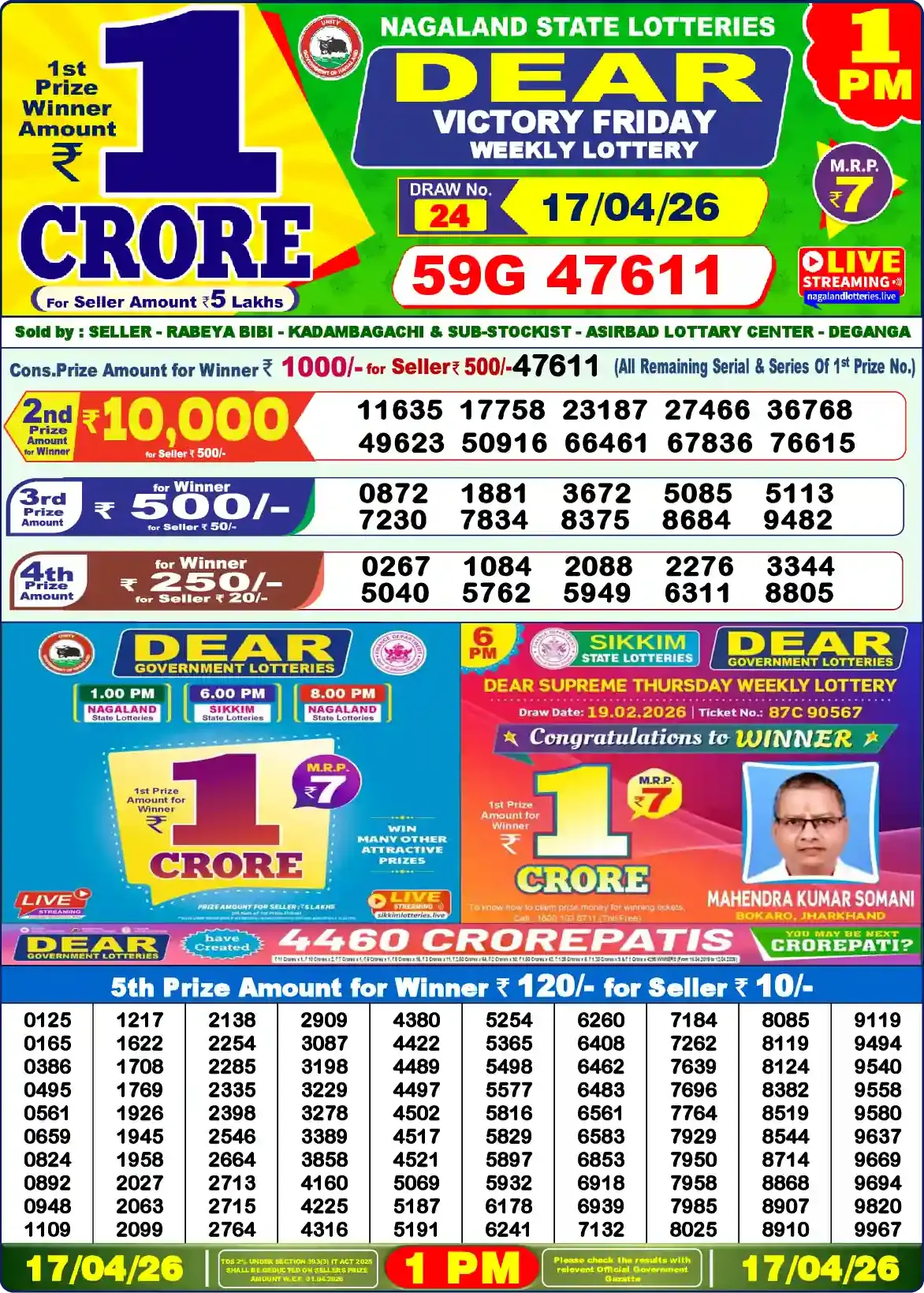 Winning series and full ticket numbers for 1 PM, 6 PM, and 8 PM (IST) draws, with PDF and date-wise archive. Last updated: April 17, 2026, 1:11 PM. If the sheet is slightly delayed, please check again.