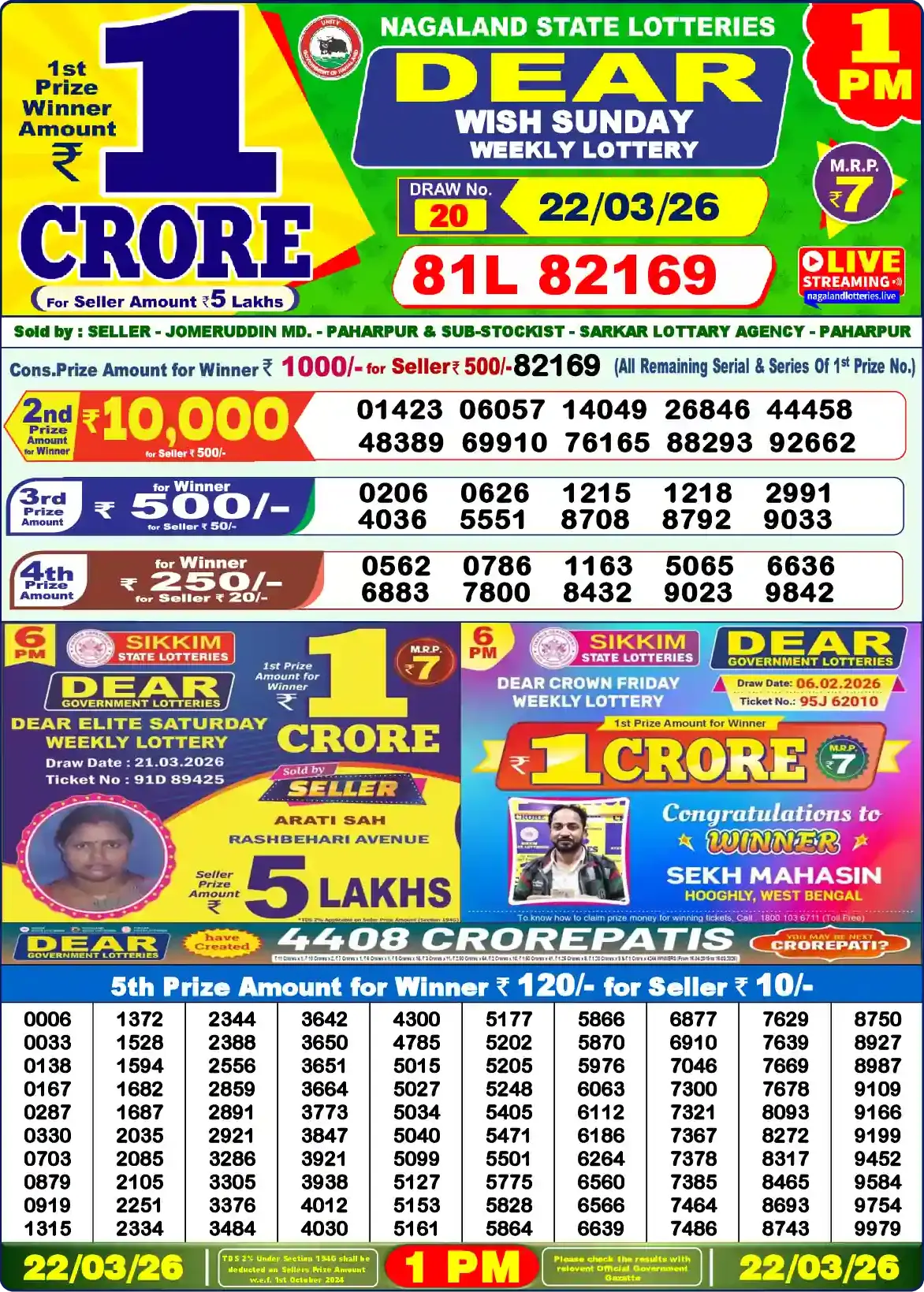 Winning series and full ticket numbers for 1 PM, 6 PM, and 8 PM (IST) draws, with PDF and date-wise archive. Last updated: March 22, 2026, 8:09 PM. If the sheet is slightly delayed, please check again.