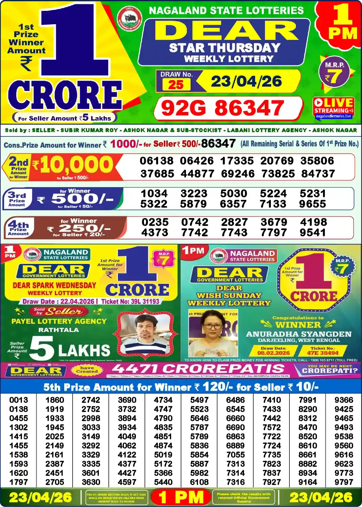 Winning series and full ticket numbers for 1 PM, 6 PM, and 8 PM (IST) draws, with PDF and date-wise archive. Last updated: April 22, 2026, 1:09 PM. If the sheet is slightly delayed, please check again.