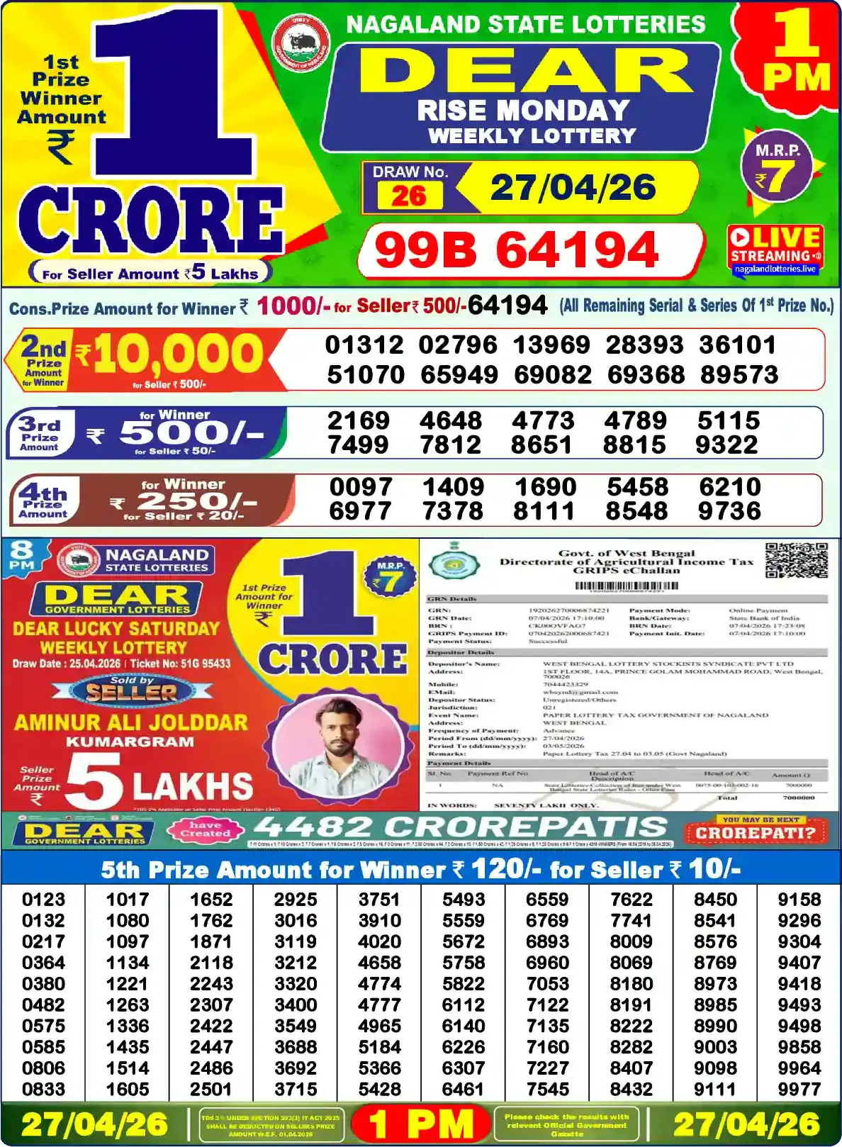 Winning series and full ticket numbers for 1 PM, 6 PM, and 8 PM (IST) draws, with PDF and date-wise archive. Last updated: April 26, 2026, 1:10 PM. If the sheet is slightly delayed, please check again.
