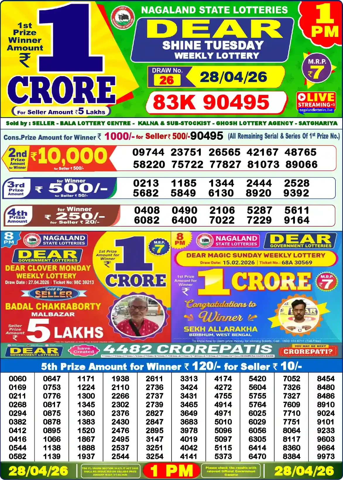 Winning series and full ticket numbers for 1 PM, 6 PM, and 8 PM (IST) draws, with PDF and date-wise archive. Last updated: April 27, 2026, 1:10 PM. If the sheet is slightly delayed, please check again.
