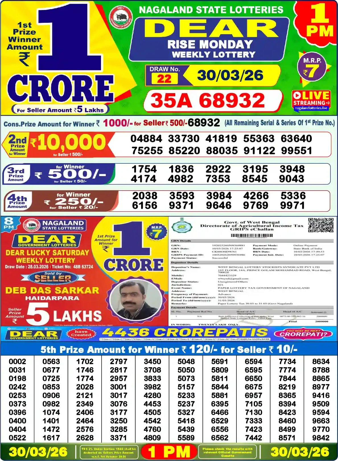 Dear CLOVER MONDAY (Draw No. 22) — Official Nagaland State Lotteries (Govt. of Nagaland), Directorate of State Lotteries, Kohima. Draw date: 30.03.2026 at 08:00 PM.