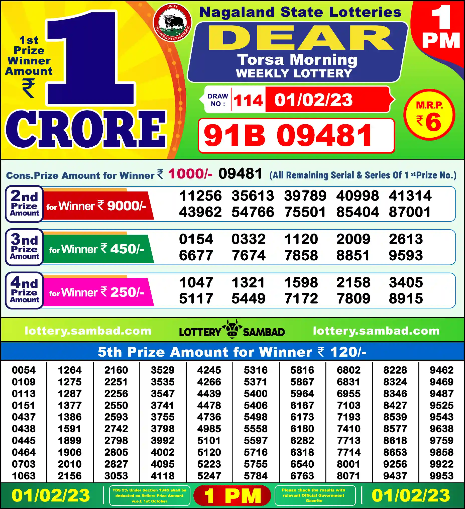 | 5th Prize | 0054, 0109, 0113, 0151, 0437, 0438, 0445, 0464, 0703, 1063, 1264, 1275, 1287, 1377, 1386, 1591, 1899, 1906, 2010, 2156, 2160, 2251, 2256, 2550, 2593, 2742, 2798, 2805, 2827, 3053, 3529, 3535, 3547, 3741, 3755, 3798, 3992, 4002, 4095, 4118, 4245, 4266, 4439, 4478, 4736, 4985, 5101, 5120, 5223, 5247, 5316, 5371, 5400, 5406, 5498, 5558, 5597, 5716, 5755, 5784, 5816, 5867, 5964, 6167, 6173, 6180, 6282, 6318, 6540, 6763, 6802, 6831, 6955, 7103, 7193, 7410, 7713, 7714, 8001, 8071, 8228, 8324, 8346, 8427, 8539, 8577, 8618, 8653, 9256, 9437, 9462, 9469, 9487, 9525, 9543, 9638, 9759, 9858, 9922, 9953 |