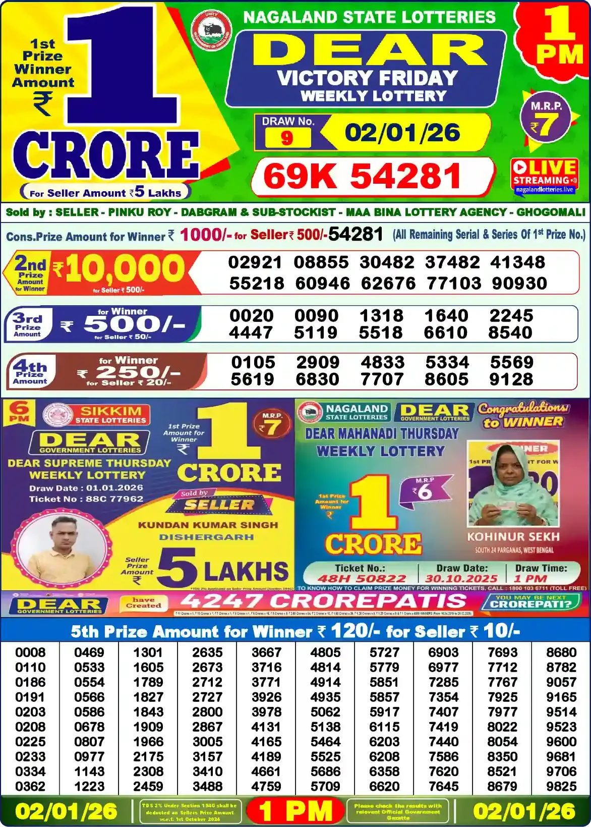 | 5th Prize | 0114, 0204, 0505, 0525, 0901, 0954, 1099, 1117, 1254, 1319, 1331, 1437, 1550, 1573, 1627, 1840, 1849, 2224, 2273, 2449, 2473, 2504, 2558, 2657, 2685, 2721, 2995, 3105, 3191, 3384, 3523, 3570, 3662, 3775, 3815, 3946, 3994, 4116, 4164, 4171, 4205, 4438, 4490, 4560, 4639, 4693, 4719, 4764, 4768, 4799, 4805, 4871, 4949, 4957, 5095, 5179, 5237, 5317, 5604, 5654, 5692, 5882, 5950, 6004, 6023, 6467, 6571, 6590, 6689, 6693, 6792, 6925, 7124, 7292, 7295, 7333, 7343, 7448, 7483, 7696, 7895, 7905, 7919, 7968, 8129, 8280, 8287, 8291, 8704, 8761, 8821, 8963, 9019, 9416, 9495, 9573, 9789, 9853, 9912, 9976 |