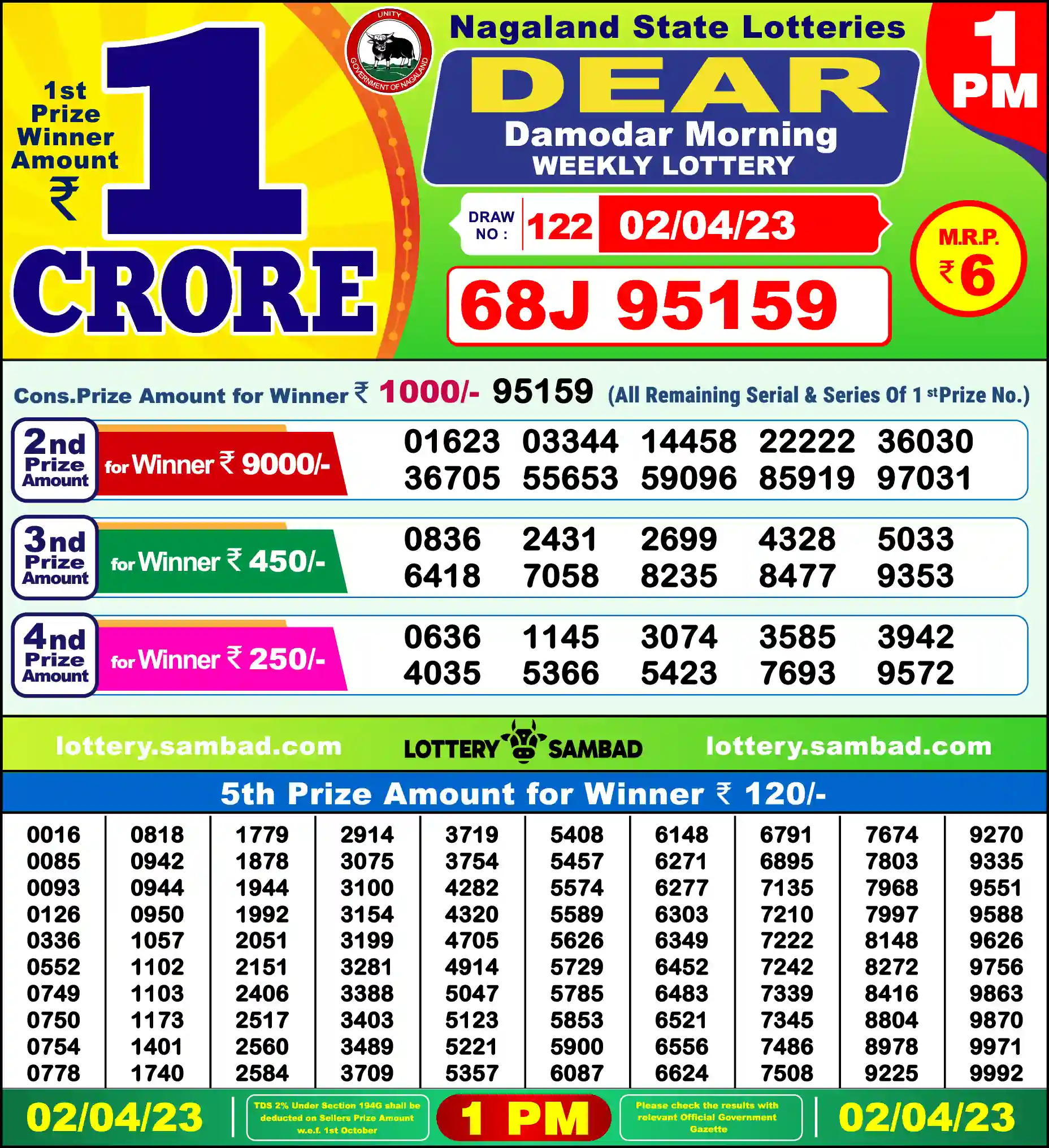 | 5th Prize | 0012, 0023, 0083, 0259, 0294, 0340, 0444, 0472, 0508, 0530, 0696, 0760, 1232, 1332, 1444, 1451, 1499, 1550, 1590, 1609, 1629, 1914, 1958, 2157, 2224, 2317, 2358, 2382, 2506, 2546, 2967, 2990, 3164, 3179, 3269, 3351, 3402, 3510, 3800, 3887, 3917, 4024, 4042, 4258, 4393, 4508, 4553, 4824, 4883, 4953, 5189, 5210, 5251, 5524, 5684, 5746, 5861, 5914, 5920, 5989, 5998, 6090, 6169, 6171, 6232, 6329, 6830, 6975, 6991, 7118, 7185, 7328, 7492, 7575, 7616, 7702, 7746, 7813, 7844, 7886, 8119, 8187, 8316, 8337, 8445, 8529, 8696, 8785, 8796, 8903, 8967, 9155, 9188, 9342, 9394, 9847, 9891, 9923, 9928, 9956 |