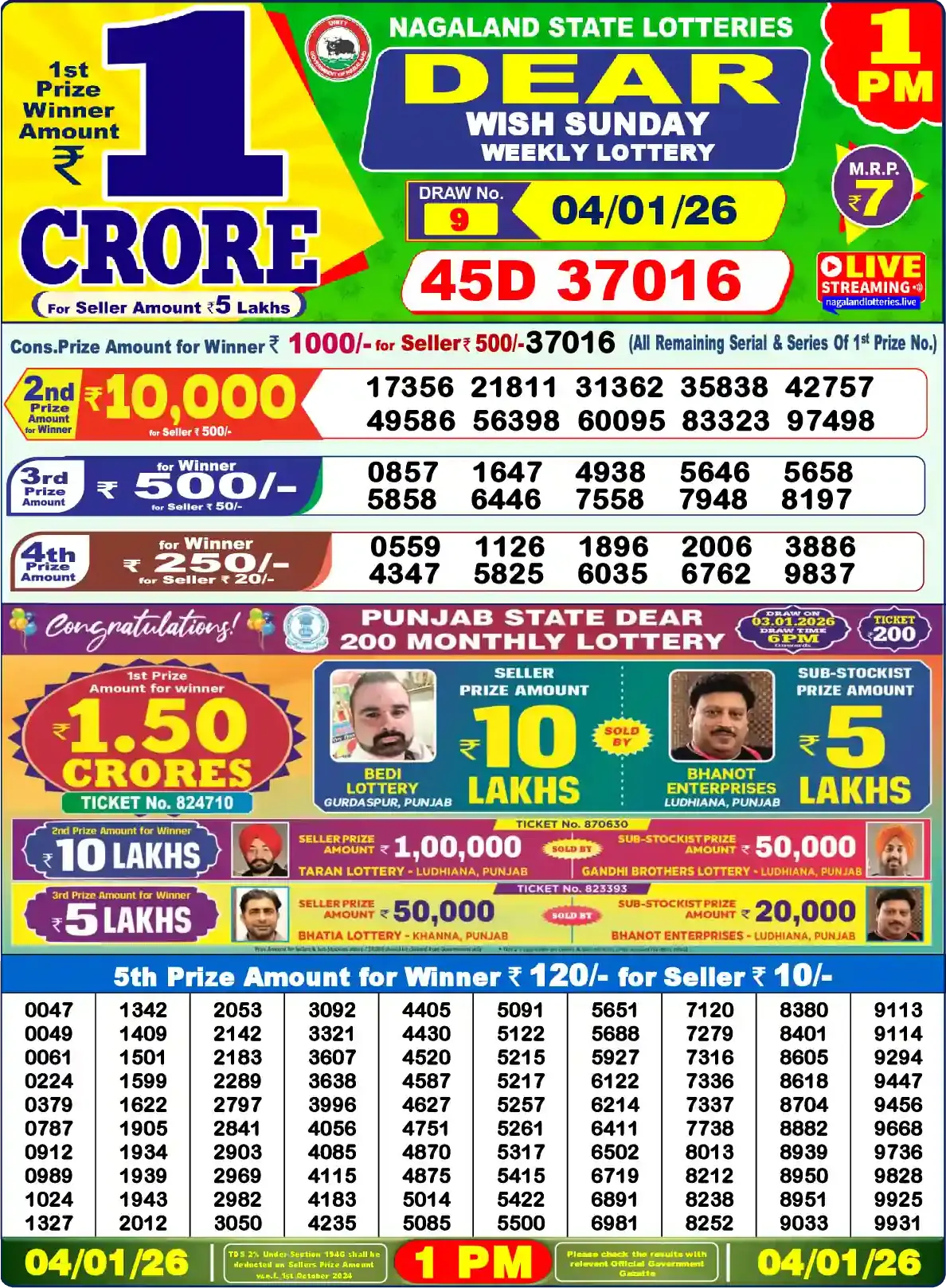 | 5th Prize | 0115, 0188, 0205, 0289, 0310, 0445, 0547, 0572, 0610, 0658, 0765, 0772, 0828, 0882, 1134, 1153, 1165, 1218, 1482, 1655, 1660, 1708, 1807, 1822, 1978, 2019, 2208, 2299, 2383, 2520, 2654, 2755, 3018, 3068, 3160, 3297, 3454, 3662, 3755, 3767, 3928, 3944, 4194, 4248, 4337, 4400, 4419, 4427, 4665, 4858, 4941, 4977, 4999, 5104, 5146, 5201, 5298, 5318, 5438, 5513, 5595, 5703, 6200, 6314, 6398, 6404, 6629, 6729, 6738, 6758, 6788, 6916, 6989, 7246, 7279, 7342, 7404, 7423, 7660, 8048, 8084, 8107, 8193, 8469, 8776, 8791, 8819, 9044, 9118, 9200, 9208, 9209, 9222, 9232, 9266, 9297, 9514, 9575, 9835, 9975 |