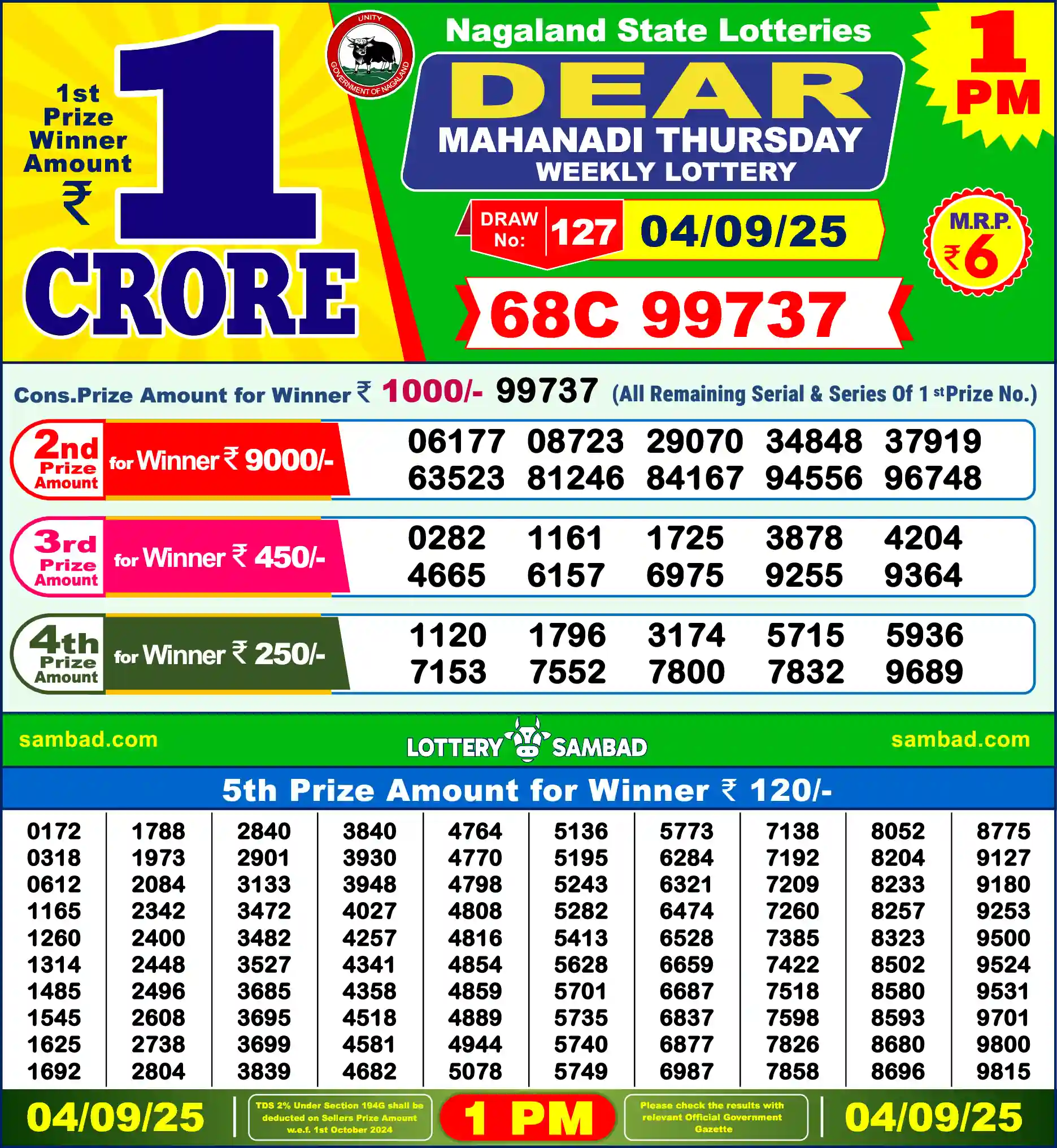| 5th Prize | 0172, 0318, 0612, 1165, 1260, 1314, 1485, 1545, 1625, 1692, 1788, 1973, 2084, 2342, 2400, 2448, 2496, 2608, 2738, 2804, 2840, 2901, 3133, 3472, 3482, 3527, 3685, 3695, 3699, 3839, 3840, 3930, 3948, 4027, 4257, 4341, 4358, 4518, 4581, 4682, 4764, 4770, 4798, 4808, 4816, 4854, 4859, 4889, 4944, 5078, 5136, 5195, 5243, 5282, 5413, 5628, 5701, 5735, 5740, 5749, 5773, 6284, 6321, 6474, 6528, 6659, 6687, 6837, 6877, 6987, 7138, 7192, 7209, 7260, 7385, 7422, 7518, 7598, 7826, 7858, 8052, 8204, 8233, 8257, 8323, 8502, 8580, 8593, 8680, 8696, 8775, 9127, 9180, 9253, 9500, 9524, 9531, 9701, 9800, 9815 |