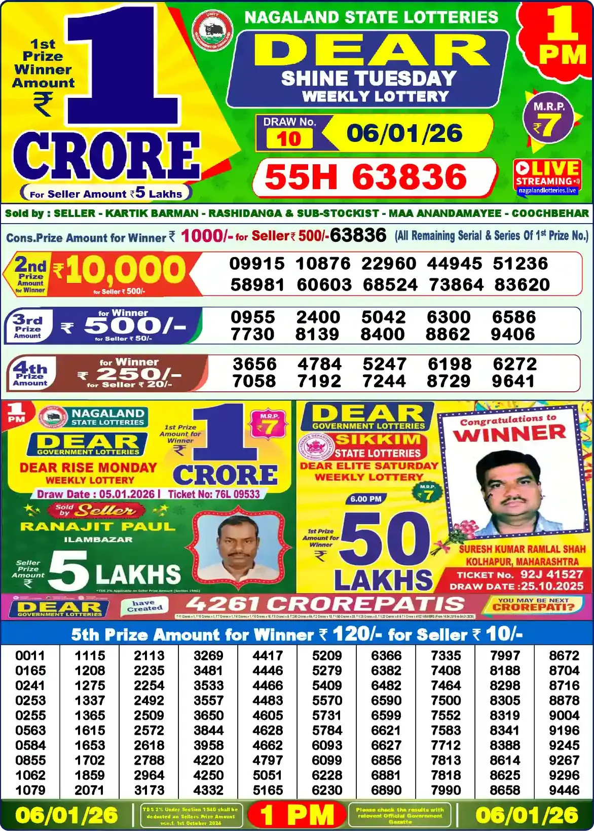 | 5th Prize | 0026, 0044, 0258, 0269, 0307, 0339, 0544, 0786, 0954, 1138, 1212, 1521, 1588, 1692, 2083, 2119, 2497, 2515, 2580, 2730, 3032, 3043, 3138, 3150, 3245, 3270, 3362, 3382, 3415, 3546, 3574, 3633, 3888, 3985, 4182, 4189, 4205, 4367, 4375, 4405, 5060, 5093, 5118, 5136, 5154, 5291, 5337, 5559, 5638, 5721, 5750, 5823, 5863, 5879, 5929, 5944, 5947, 5957, 5976, 6112, 6201, 6202, 6589, 6630, 6667, 6720, 6928, 6995, 7047, 7056, 7106, 7113, 7507, 7527, 7531, 7798, 7807, 7860, 7901, 7904, 7984, 7993, 8213, 8641, 8733, 8961, 9069, 9269, 9280, 9291, 9348, 9385, 9399, 9413, 9428, 9491, 9499, 9633, 9732, 9772 |