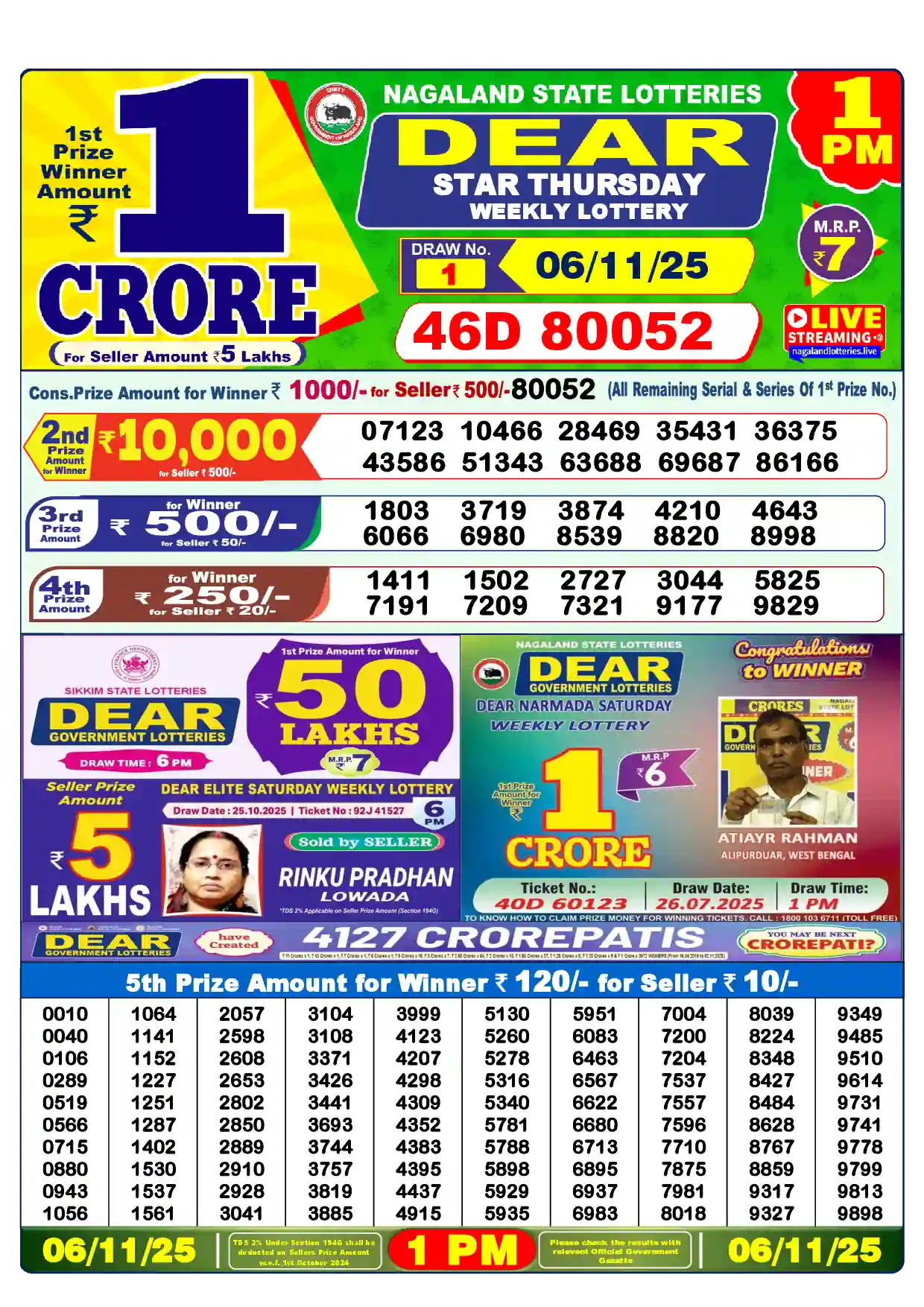 | 5th Prize | 0010, 0040, 0106, 0289, 0519, 0566, 0715, 0880, 0943, 1056, 1064, 1141, 1152, 1227, 1251, 1287, 1402, 1530, 1537, 1561, 2057, 2598, 2608, 2653, 2802, 2850, 2889, 2910, 2928, 3041, 3104, 3108, 3371, 3426, 3441, 3693, 3744, 3757, 3819, 3885, 3999, 4123, 4207, 4298, 4309, 4352, 4383, 4395, 4437, 4915, 5130, 5260, 5278, 5316, 5340, 5781, 5788, 5898, 5929, 5935, 5951, 6083, 6463, 6567, 6622, 6680, 6713, 6895, 6937, 6983, 7004, 7200, 7204, 7537, 7557, 7596, 7710, 7875, 7981, 8018, 8039, 8224, 8348, 8427, 8484, 8628, 8767, 8859, 9317, 9327, 9349, 9485, 9510, 9614, 9731, 9741, 9778, 9799, 9813, 9898 |
