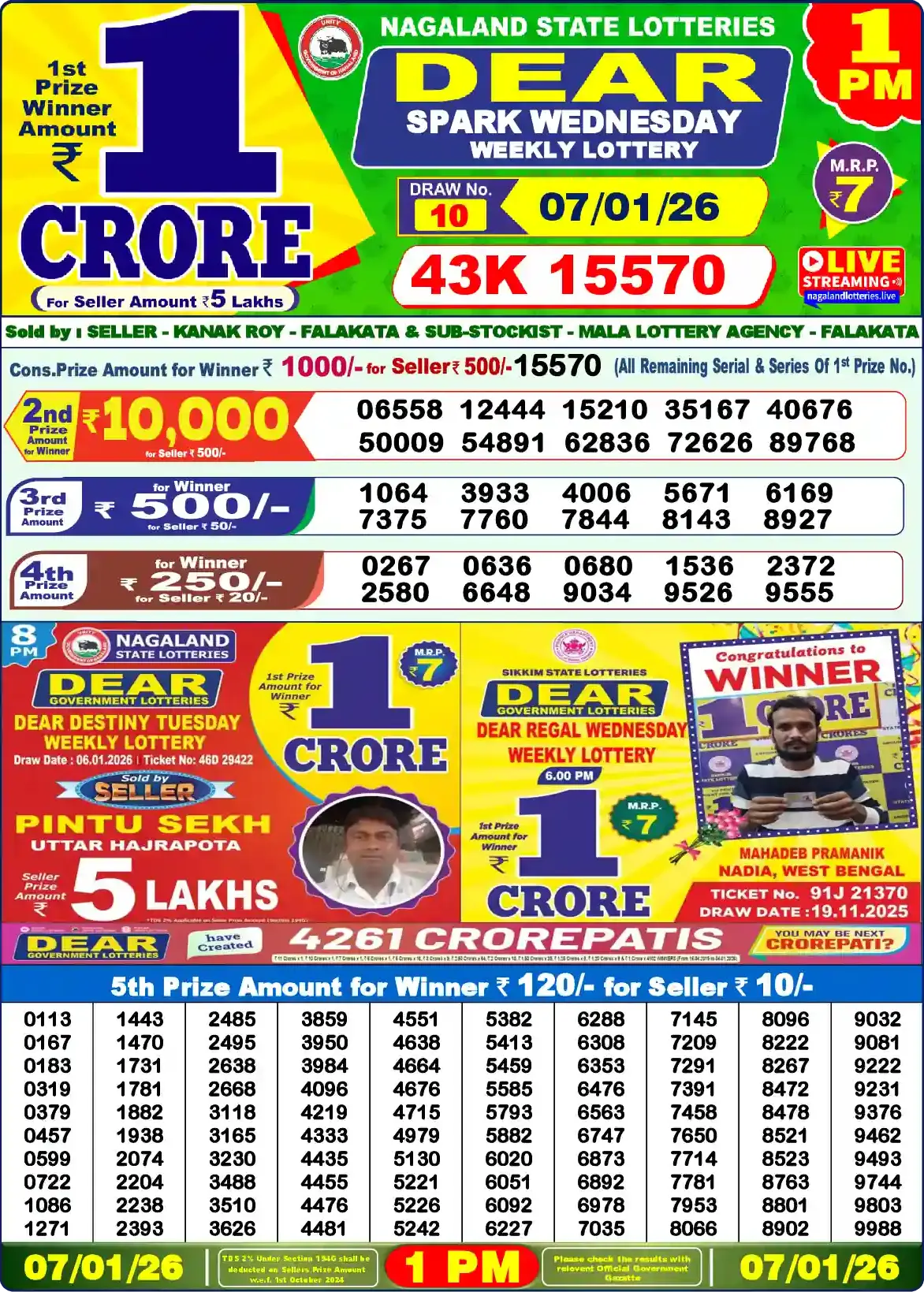 | 5th Prize | 0118, 0181, 0203, 0425, 0520, 0584, 0654, 0714, 0762, 0848, 0905, 0941, 1206, 1634, 1814, 1940, 2510, 2772, 3047, 3099, 3117, 3182, 3217, 3413, 3443, 3480, 3546, 3600, 3602, 3667, 3836, 4199, 4243, 4252, 4259, 4273, 4406, 4527, 4578, 4830, 5027, 5094, 5110, 5113, 5132, 5239, 5253, 5269, 5363, 5420, 5553, 5619, 5637, 5711, 5954, 5980, 6057, 6092, 6118, 6175, 6221, 6255, 6325, 6488, 6650, 6697, 6730, 6755, 6828, 6981, 6996, 7053, 7055, 7057, 7084, 7109, 7260, 7380, 7449, 7768, 7950, 8082, 8264, 8338, 8350, 8534, 8579, 8675, 8805, 8837, 8869, 8982, 9009, 9068, 9175, 9246, 9287, 9388, 9977, 9997 |