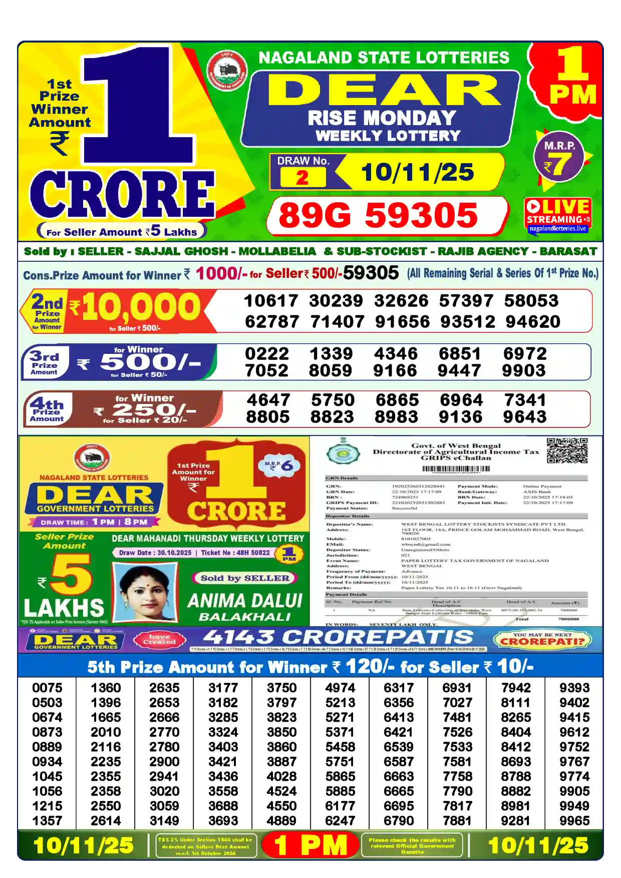 | 5th Prize | 0075, 0503, 0674, 0873, 0889, 0934, 1045, 1056, 1215, 1357, 1360, 1396, 1665, 2010, 2116, 2235, 2355, 2358, 2550, 2614, 2635, 2653, 2666, 2770, 2780, 2900, 2941, 3020, 3059, 3149, 3177, 3182, 3285, 3324, 3403, 3421, 3436, 3558, 3688, 3693, 3750, 3797, 3823, 3850, 3860, 3887, 4028, 4524, 4550, 4889, 4974, 5213, 5271, 5371, 5458, 5751, 5865, 5885, 6177, 6247, 6317, 6356, 6413, 6421, 6539, 6587, 6663, 6665, 6695, 6790, 6931, 7027, 7481, 7526, 7533, 7581, 7758, 7790, 7817, 7881, 7942, 8111, 8265, 8404, 8412, 8693, 8788, 8882, 8981, 9281, 9393, 9402, 9415, 9612, 9752, 9767, 9774, 9905, 9949, 9965 |