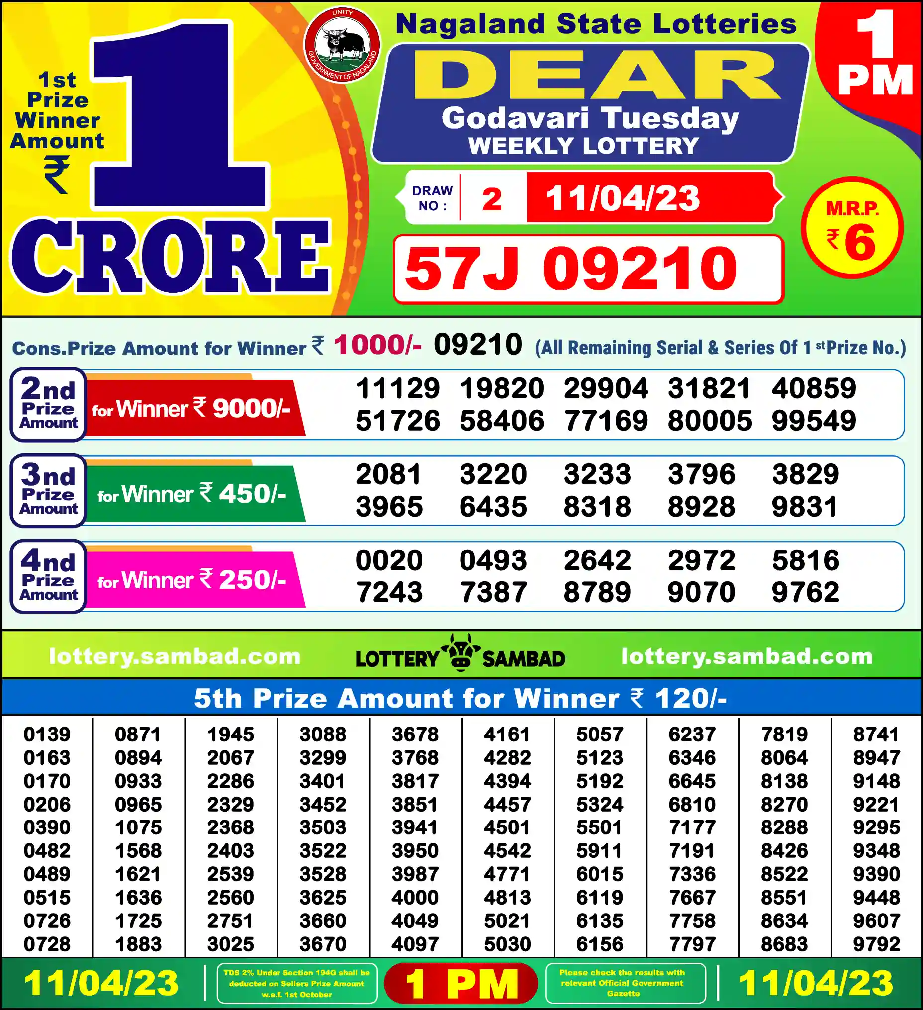 | 3rd Prize | 0614, 0791, 1326, 1366, 2406, 3223, 3846, 4617, 7252, 9234 |
