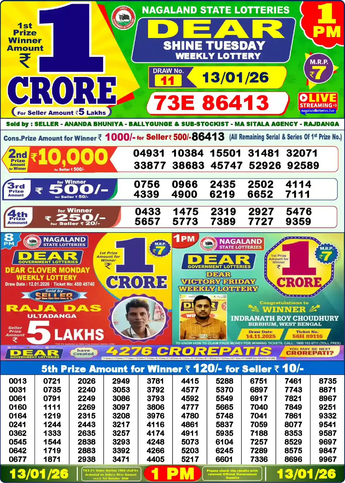 | 5th Prize | 0013, 0031, 0061, 0160, 0164, 0241, 0362, 0545, 0642, 0677, 0721, 0735, 0791, 1111, 1219, 1244, 1333, 1544, 1719, 1871, 2026, 2240, 2249, 2269, 2315, 2443, 2635, 2838, 2883, 2938, 2949, 3053, 3086, 3097, 3208, 3217, 3257, 3293, 3392, 3471, 3781, 3792, 3793, 3806, 3976, 4116, 4174, 4248, 4266, 4405, 4415, 4577, 4592, 4777, 4780, 4861, 4911, 5073, 5203, 5217, 5288, 5370, 5549, 5665, 5748, 5837, 5935, 6104, 6245, 6601, 6751, 6897, 6917, 7040, 7041, 7059, 7188, 7257, 7289, 7336, 7461, 7743, 7821, 7849, 7861, 8077, 8353, 8529, 8575, 8696, 8735, 8871, 8967, 9251, 9332, 9541, 9587, 9697, 9847, 9967 |