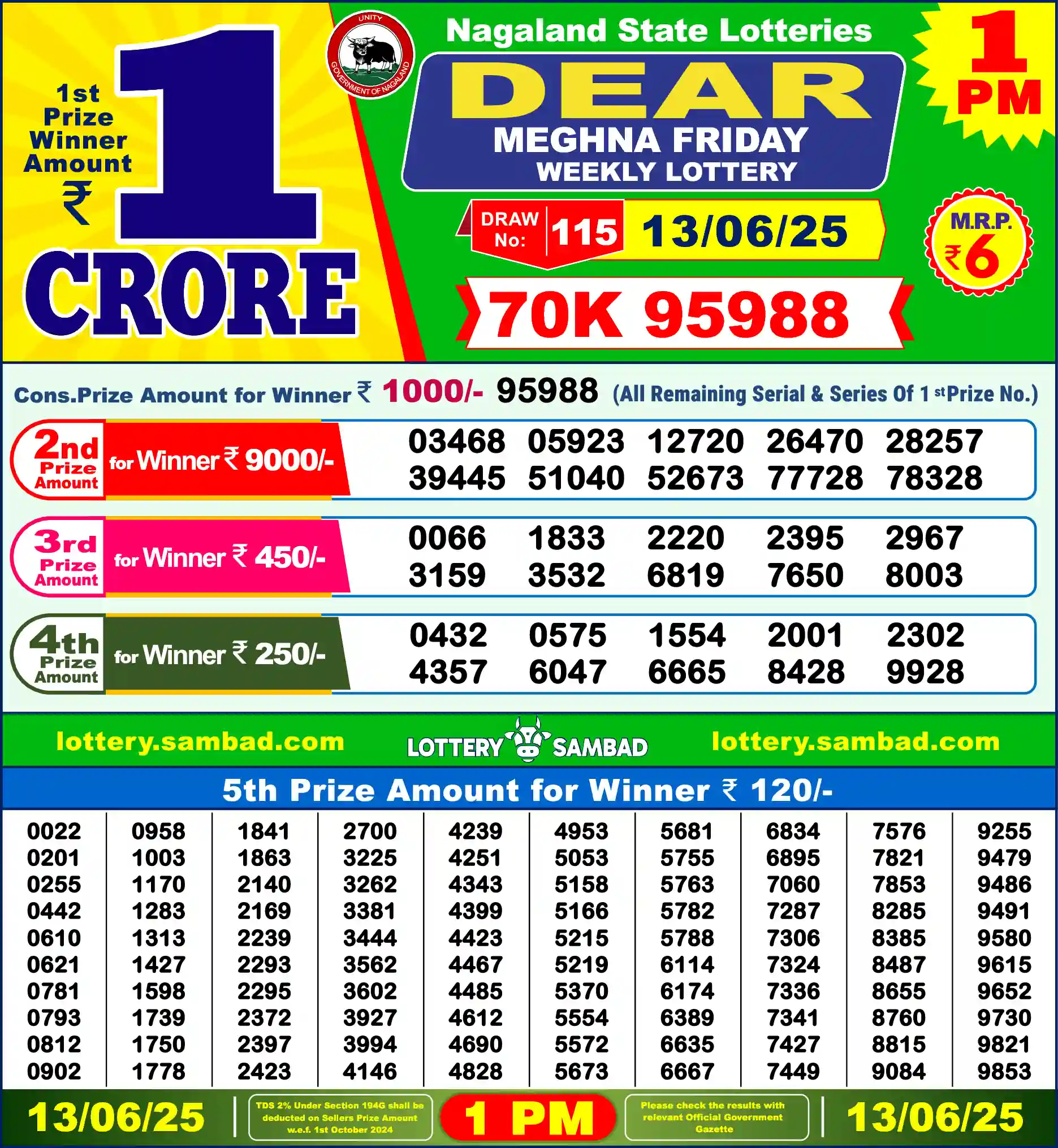 | 5th Prize | 0022, 0201, 0255, 0442, 0610, 0621, 0781, 0793, 0812, 0902, 0958, 1003, 1170, 1283, 1313, 1427, 1598, 1739, 1750, 1778, 1841, 1863, 2140, 2169, 2239, 2293, 2295, 2372, 2397, 2423, 2700, 3225, 3262, 3381, 3444, 3562, 3602, 3927, 3994, 4146, 4239, 4251, 4343, 4399, 4423, 4467, 4485, 4612, 4690, 4828, 4953, 5053, 5158, 5166, 5215, 5219, 5370, 5554, 5572, 5673, 5681, 5755, 5763, 5782, 5788, 6114, 6174, 6389, 6635, 6667, 6834, 6895, 7060, 7287, 7306, 7324, 7336, 7341, 7427, 7449, 7576, 7821, 7853, 8285, 8385, 8487, 8655, 8760, 8815, 9084, 9255, 9479, 9486, 9491, 9580, 9615, 9652, 9730, 9821, 9853 |
