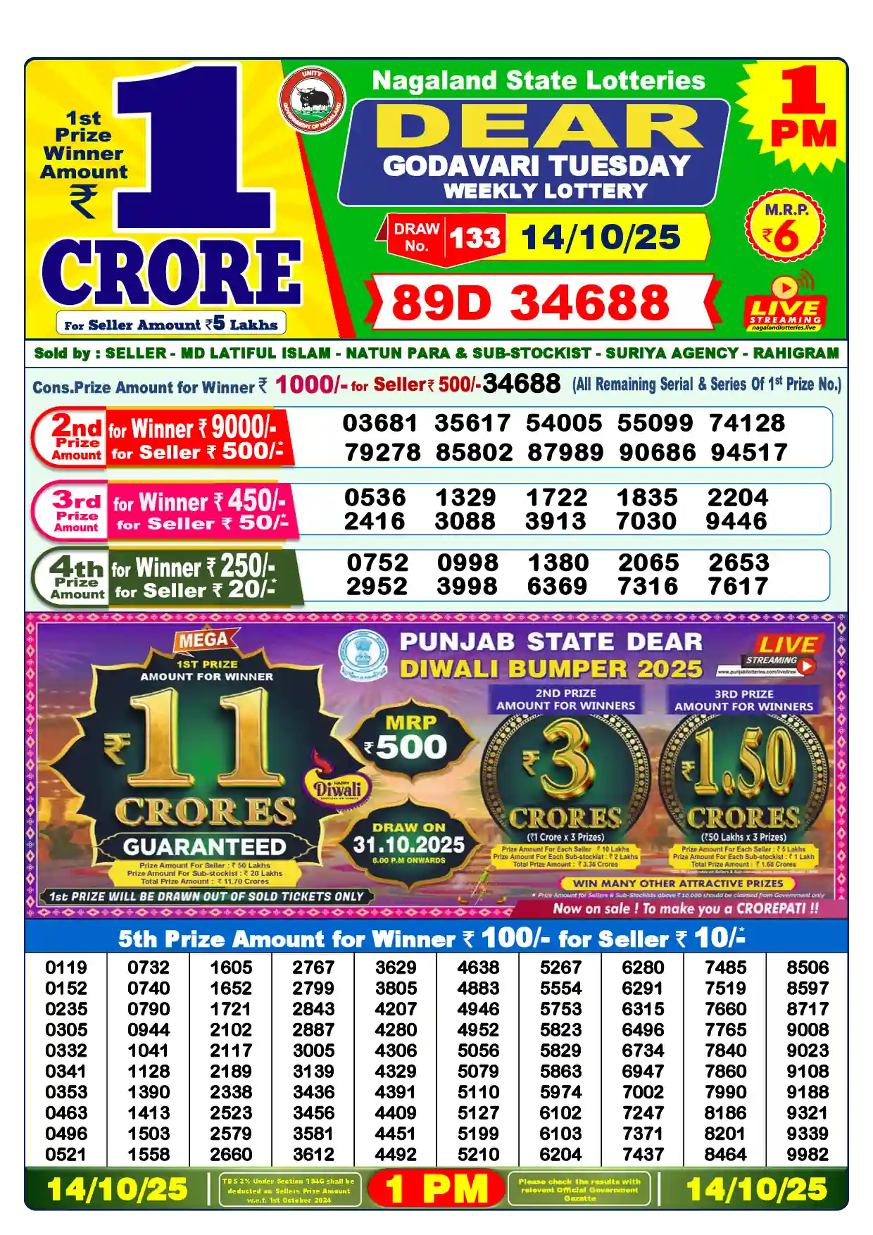 | 5th Prize | 0140, 0328, 0364, 0373, 0460, 0655, 0671, 0727, 0748, 0771, 0865, 0886, 1005, 1132, 1150, 1217, 1228, 1256, 1304, 1483, 1583, 1768, 1925, 1972, 2116, 2241, 2245, 2255, 2460, 2473, 2559, 2773, 2775, 2957, 3028, 3034, 3201, 3208, 3279, 3299, 3446, 3525, 3645, 3649, 3689, 4012, 4162, 4168, 4249, 4414, 4447, 4657, 4674, 4794, 4805, 4809, 4825, 4862, 4868, 4898, 4987, 5043, 5165, 5335, 5356, 5718, 5781, 5875, 6033, 6312, 6322, 6340, 6480, 6500, 6626, 6747, 6774, 6955, 7237, 7354, 7357, 7409, 7537, 7676, 8170, 8256, 8420, 8438, 8616, 8998, 9059, 9077, 9238, 9261, 9276, 9375, 9510, 9665, 9804, 9964 |