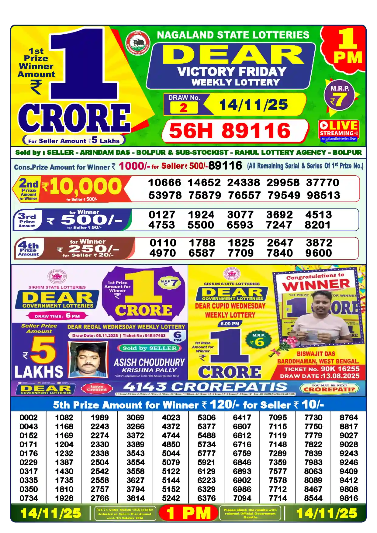 | 5th Prize | 0014, 0097, 0103, 0208, 0304, 0382, 0485, 0874, 0877, 1029, 1132, 1223, 1281, 1324, 1448, 1530, 1567, 1600, 1689, 1813, 1864, 2014, 2096, 2397, 2765, 2788, 2884, 2988, 3077, 3120, 3417, 3442, 3475, 3476, 3717, 3845, 3857, 3864, 3950, 4122, 4152, 4198, 4289, 4608, 4619, 4745, 4776, 4790, 4804, 4825, 4857, 4888, 4991, 5012, 5037, 5093, 5145, 5175, 5234, 5252, 5391, 5922, 5941, 6027, 6093, 6215, 6279, 6987, 6989, 7009, 7095, 7098, 7215, 7463, 7659, 7805, 7880, 7944, 8012, 8034, 8142, 8391, 8431, 8461, 8527, 8706, 8708, 8808, 8889, 8899, 8994, 8996, 9026, 9316, 9522, 9655, 9669, 9705, 9724, 9766 |