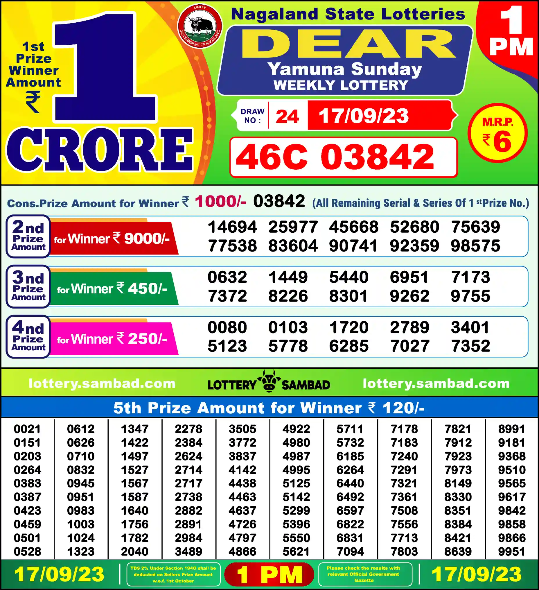 | 5th Prize | 0021, 0151, 0203, 0264, 0383, 0387, 0423, 0459, 0501, 0528, 0612, 0626, 0710, 0832, 0945, 0951, 0983, 1003, 1024, 1323, 1347, 1422, 1497, 1527, 1567, 1587, 1640, 1756, 1782, 2040, 2278, 2384, 2624, 2714, 2717, 2738, 2882, 2891, 2984, 3489, 3505, 3772, 3837, 4142, 4438, 4463, 4637, 4726, 4797, 4866, 4922, 4980, 4987, 4995, 5125, 5142, 5299, 5396, 5550, 5621, 5711, 5732, 6185, 6264, 6440, 6492, 6597, 6822, 6831, 7094, 7178, 7183, 7240, 7291, 7321, 7361, 7508, 7556, 7713, 7803, 7821, 7912, 7923, 7973, 8149, 8330, 8351, 8384, 8421, 8639, 8991, 9181, 9368, 9510, 9565, 9617, 9842, 9858, 9866, 9951 |