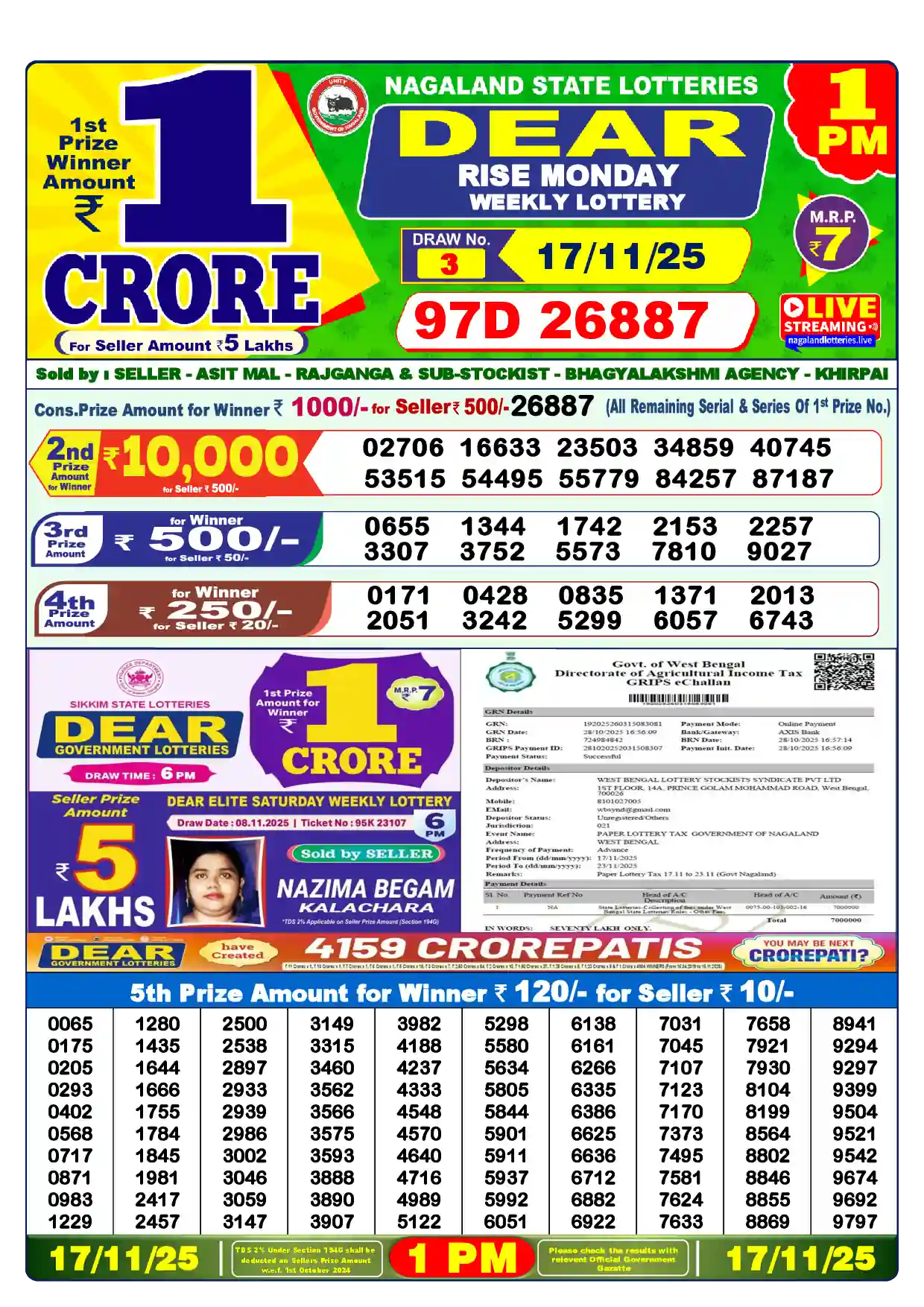 | 5th Prize | 0065, 0175, 0205, 0293, 0402, 0568, 0717, 0871, 0983, 1229, 1280, 1435, 1644, 1666, 1755, 1784, 1845, 1981, 2417, 2457, 2500, 2538, 2897, 2933, 2939, 2986, 3002, 3046, 3059, 3147, 3149, 3315, 3460, 3562, 3566, 3575, 3593, 3888, 3890, 3907, 3982, 4188, 4237, 4333, 4548, 4570, 4640, 4716, 4989, 5122, 5298, 5580, 5634, 5805, 5844, 5901, 5911, 5937, 5992, 6051, 6138, 6161, 6266, 6335, 6386, 6625, 6636, 6712, 6882, 6922, 7031, 7045, 7107, 7123, 7170, 7373, 7495, 7581, 7624, 7633, 7658, 7921, 7930, 8104, 8199, 8564, 8802, 8846, 8855, 8869, 8941, 9294, 9297, 9399, 9504, 9521, 9542, 9674, 9692, 9797 |