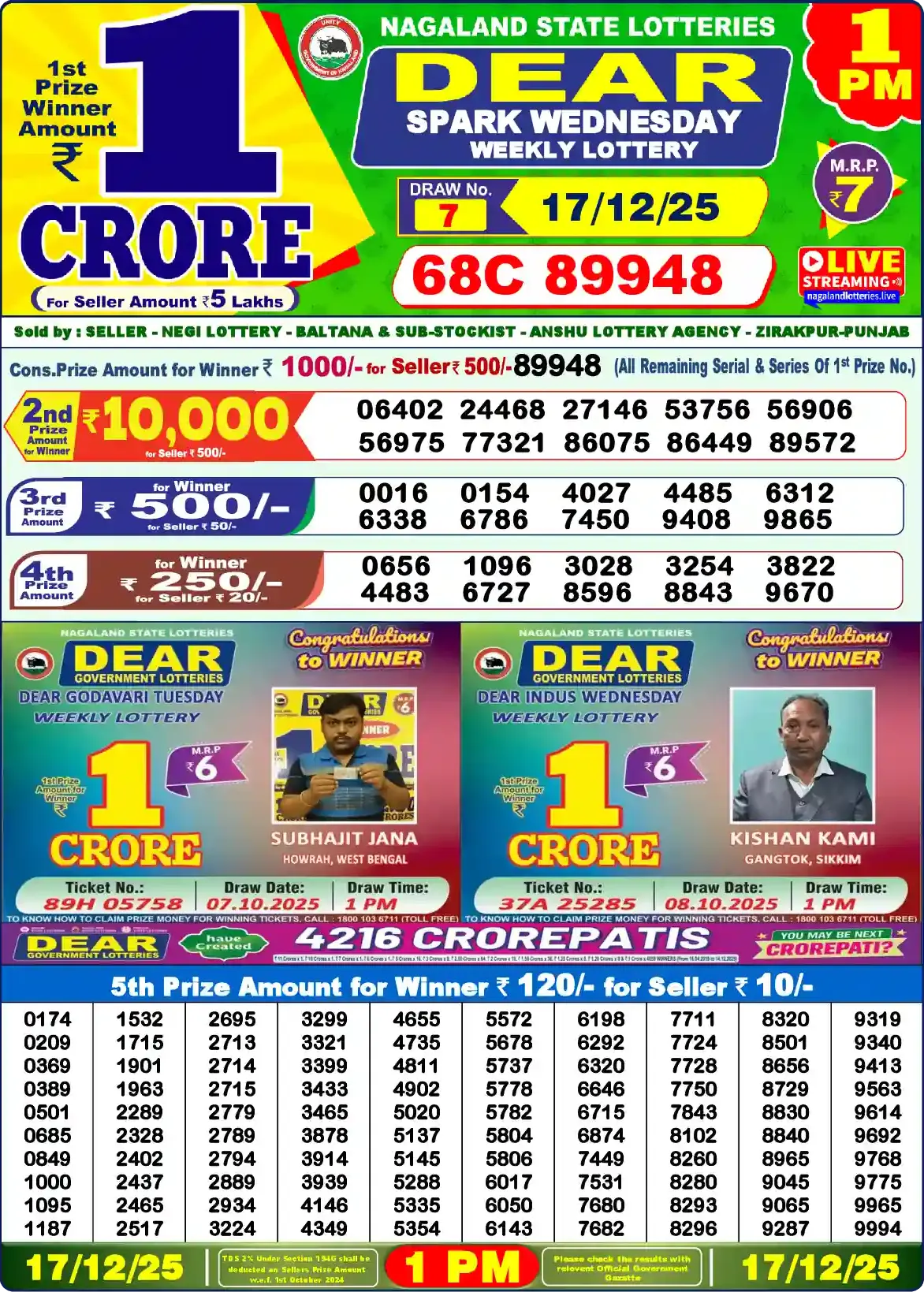| 5th Prize | 0174, 0209, 0369, 0389, 0501, 0685, 0849, 1000, 1095, 1187, 1532, 1715, 1901, 1963, 2289, 2328, 2402, 2437, 2465, 2517, 2695, 2713, 2714, 2715, 2779, 2789, 2794, 2889, 2934, 3224, 3299, 3321, 3399, 3433, 3465, 3878, 3914, 3939, 4146, 4349, 4655, 4735, 4811, 4902, 5020, 5137, 5145, 5288, 5335, 5354, 5572, 5678, 5737, 5778, 5782, 5804, 5806, 6017, 6050, 6143, 6198, 6292, 6320, 6646, 6715, 6874, 7449, 7531, 7680, 7682, 7711, 7724, 7728, 7750, 7843, 8102, 8260, 8280, 8293, 8296, 8320, 8501, 8656, 8729, 8830, 8840, 8965, 9045, 9065, 9287, 9319, 9340, 9413, 9563, 9614, 9692, 9768, 9775, 9965, 9994 |