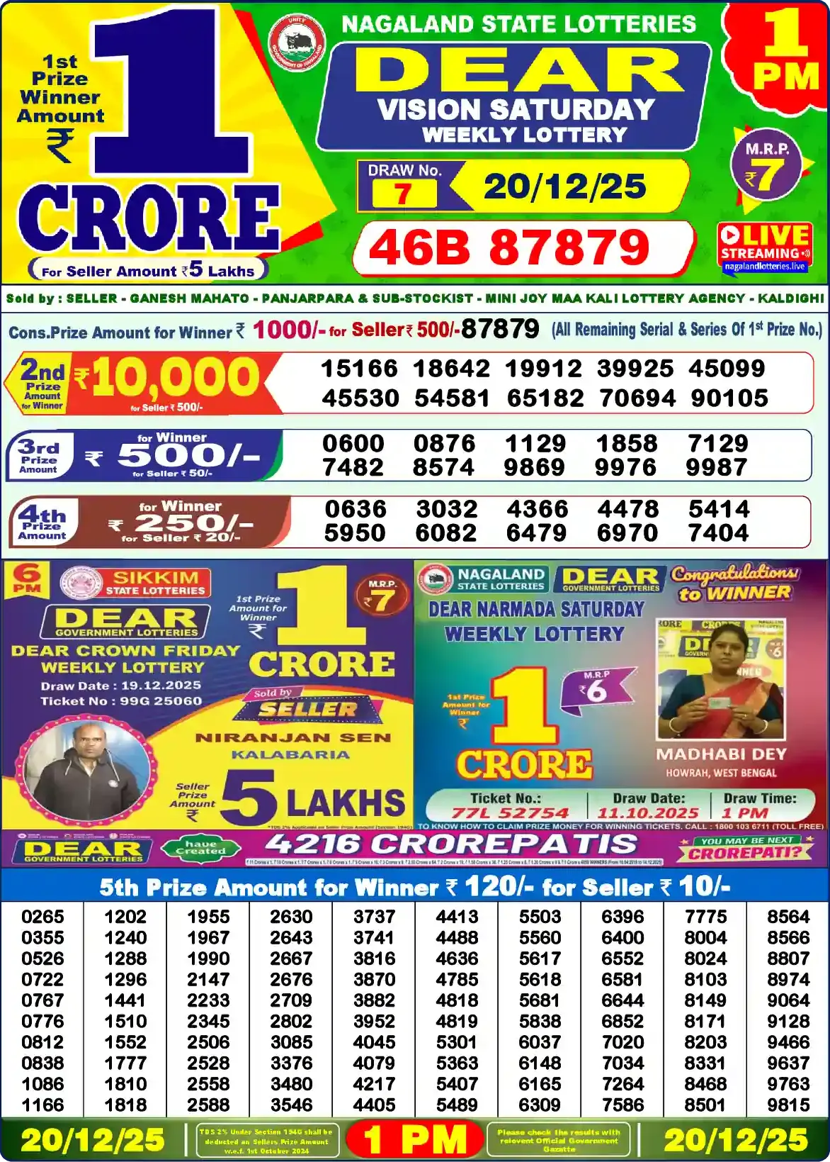 | 5th Prize | 0265, 0355, 0526, 0722, 0767, 0776, 0812, 0838, 1086, 1166, 1202, 1240, 1288, 1296, 1441, 1510, 1552, 1777, 1810, 1818, 1955, 1967, 1990, 2147, 2233, 2345, 2506, 2528, 2558, 2588, 2630, 2643, 2667, 2676, 2709, 2802, 3085, 3376, 3480, 3546, 3737, 3741, 3816, 3870, 3882, 3952, 4045, 4079, 4217, 4405, 4413, 4488, 4636, 4785, 4818, 4819, 5301, 5363, 5407, 5489, 5503, 5560, 5617, 5618, 5681, 5838, 6037, 6148, 6165, 6309, 6396, 6400, 6552, 6581, 6644, 6852, 7020, 7034, 7264, 7586, 7775, 8004, 8024, 8103, 8149, 8171, 8203, 8331, 8468, 8501, 8564, 8566, 8807, 8974, 9064, 9128, 9466, 9637, 9763, 9815 |