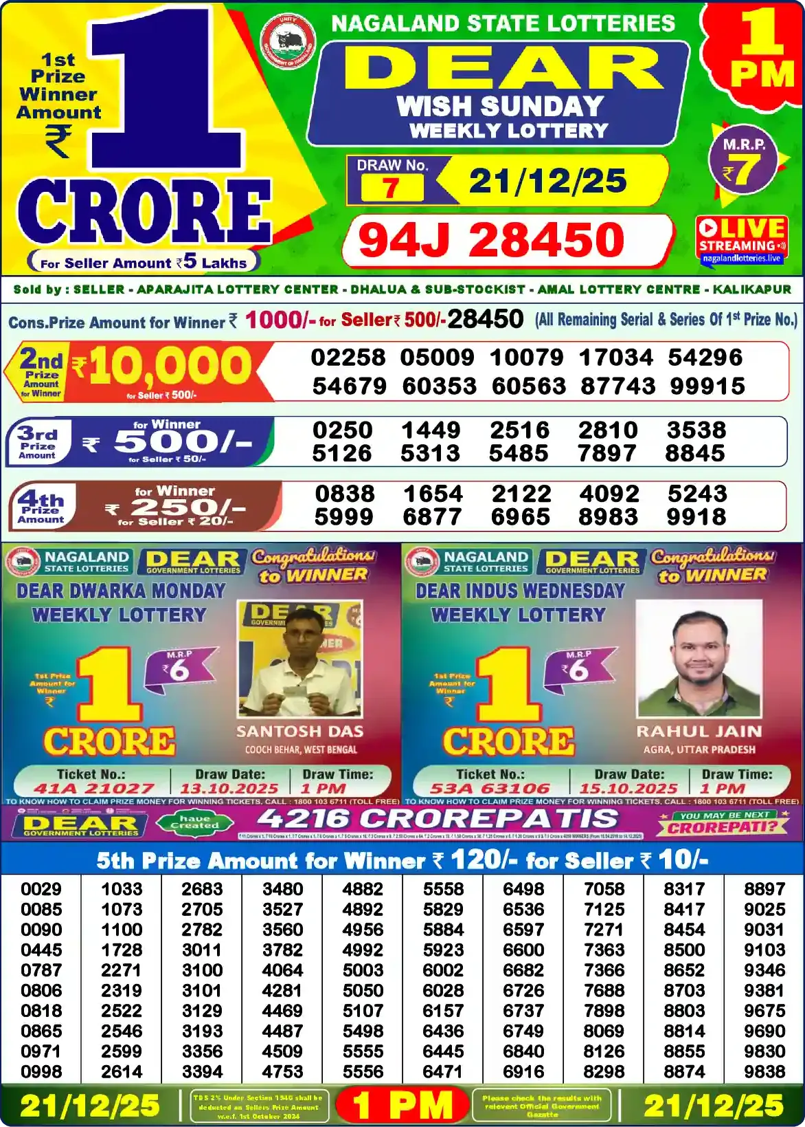 | 5th Prize | 0114, 0204, 0277, 0291, 0385, 0419, 0433, 0784, 0916, 1188, 1206, 1208, 1451, 1484, 1498, 1513, 1731, 1773, 1840, 1876, 2023, 2045, 2060, 2122, 2136, 2209, 2346, 2375, 2385, 2471, 2688, 2697, 2844, 3314, 3353, 3383, 3439, 3714, 4071, 4077, 4163, 4175, 4318, 4775, 4825, 4837, 4844, 4856, 4902, 5051, 5171, 5253, 5526, 5606, 5708, 5777, 6141, 6160, 6209, 6280, 6302, 6318, 6323, 6347, 6543, 6604, 6657, 6764, 6936, 7026, 7058, 7330, 7559, 7599, 7714, 7741, 7766, 7855, 7891, 8093, 8177, 8199, 8428, 8563, 8657, 8782, 8794, 8931, 9022, 9191, 9213, 9414, 9493, 9510, 9594, 9705, 9735, 9840, 9886, 9934 |
