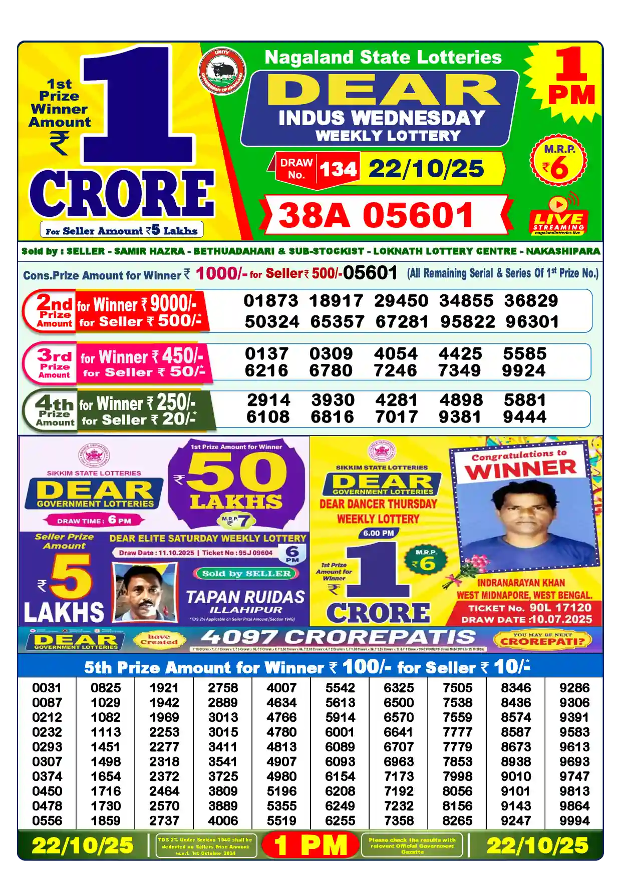 | 5th Prize | 0116, 0166, 0381, 0460, 0541, 0595, 0601, 0616, 0649, 0697, 0776, 0841, 0979, 1071, 1110, 1206, 1207, 1258, 1486, 1524, 1653, 1667, 1674, 1957, 1994, 2002, 2006, 2199, 2421, 2499, 2511, 2632, 2795, 2813, 2941, 2997, 3030, 3179, 3354, 3365, 3519, 3642, 3643, 3809, 3963, 4028, 4044, 4089, 4219, 4555, 4598, 4785, 4967, 5110, 5141, 5437, 5472, 5544, 5547, 5605, 5786, 5990, 6057, 6140, 6153, 6346, 6424, 6487, 6537, 6724, 6939, 6991, 7011, 7185, 7214, 7237, 7262, 7306, 7494, 7538, 7724, 7884, 7921, 7932, 8002, 8006, 8252, 8258, 8268, 8321, 8584, 8891, 8958, 8961, 9758, 9823, 9833, 9865, 9879, 9918 |