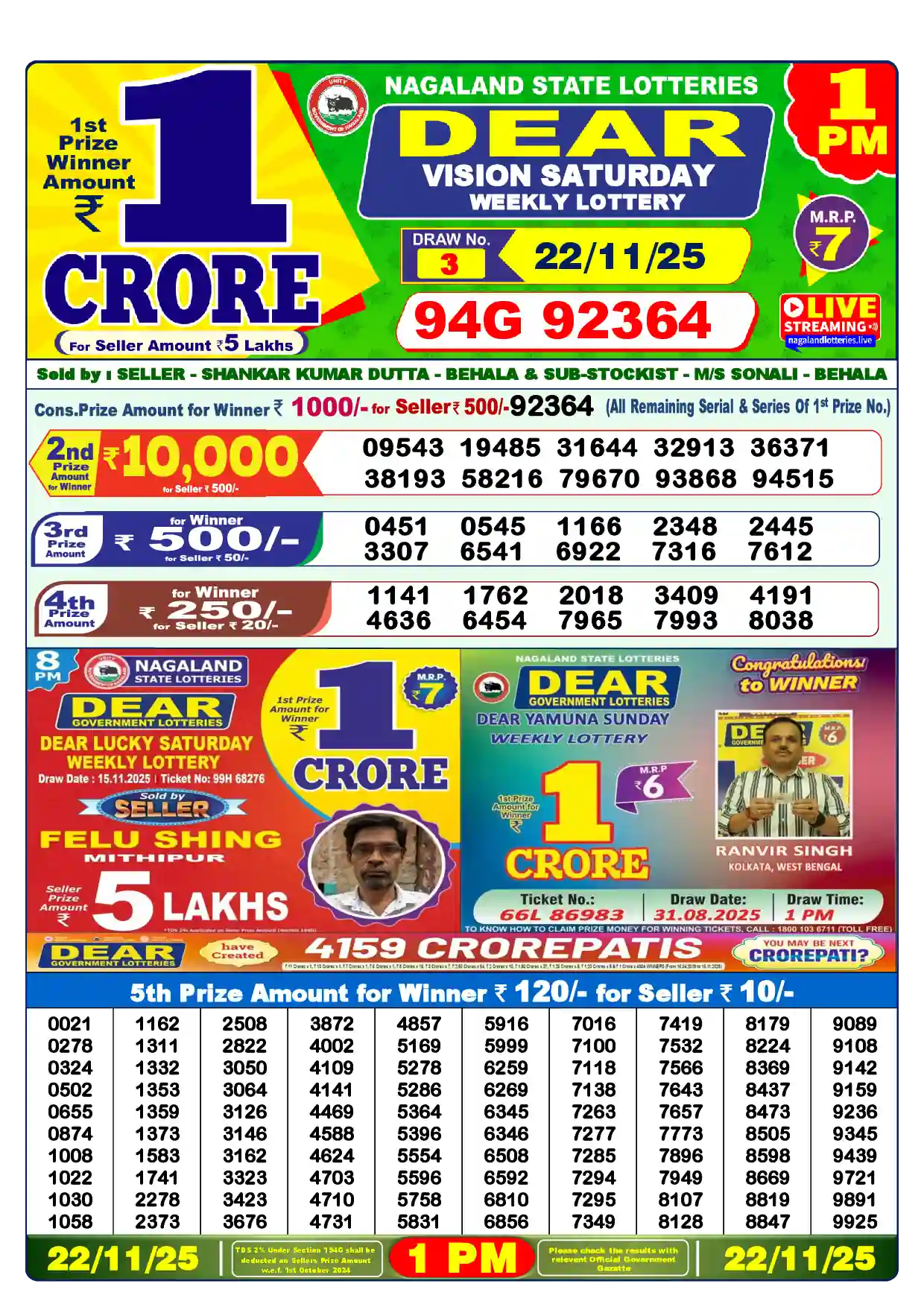| 5th Prize | 0043, 0077, 0091, 0092, 0307, 0502, 0571, 0796, 0895, 0937, 1036, 1042, 1150, 1372, 1609, 1811, 1866, 1902, 1978, 2019, 2039, 2095, 2300, 2351, 2659, 2676, 2682, 2798, 2838, 2886, 2963, 3184, 3187, 3288, 3375, 3423, 3572, 3755, 3777, 4024, 4200, 4244, 4324, 4339, 4462, 4497, 4516, 4802, 4887, 4897, 4906, 4950, 5009, 5316, 5480, 5828, 5912, 5946, 6062, 6145, 6241, 6275, 6308, 6347, 6422, 6595, 6673, 6677, 6775, 6810, 7032, 7213, 7240, 7259, 7261, 7382, 7515, 7521, 7599, 7676, 7800, 7825, 7830, 7868, 7917, 7920, 7958, 8229, 8690, 8918, 8997, 9334, 9367, 9437, 9438, 9496, 9580, 9695, 9745, 9869 |