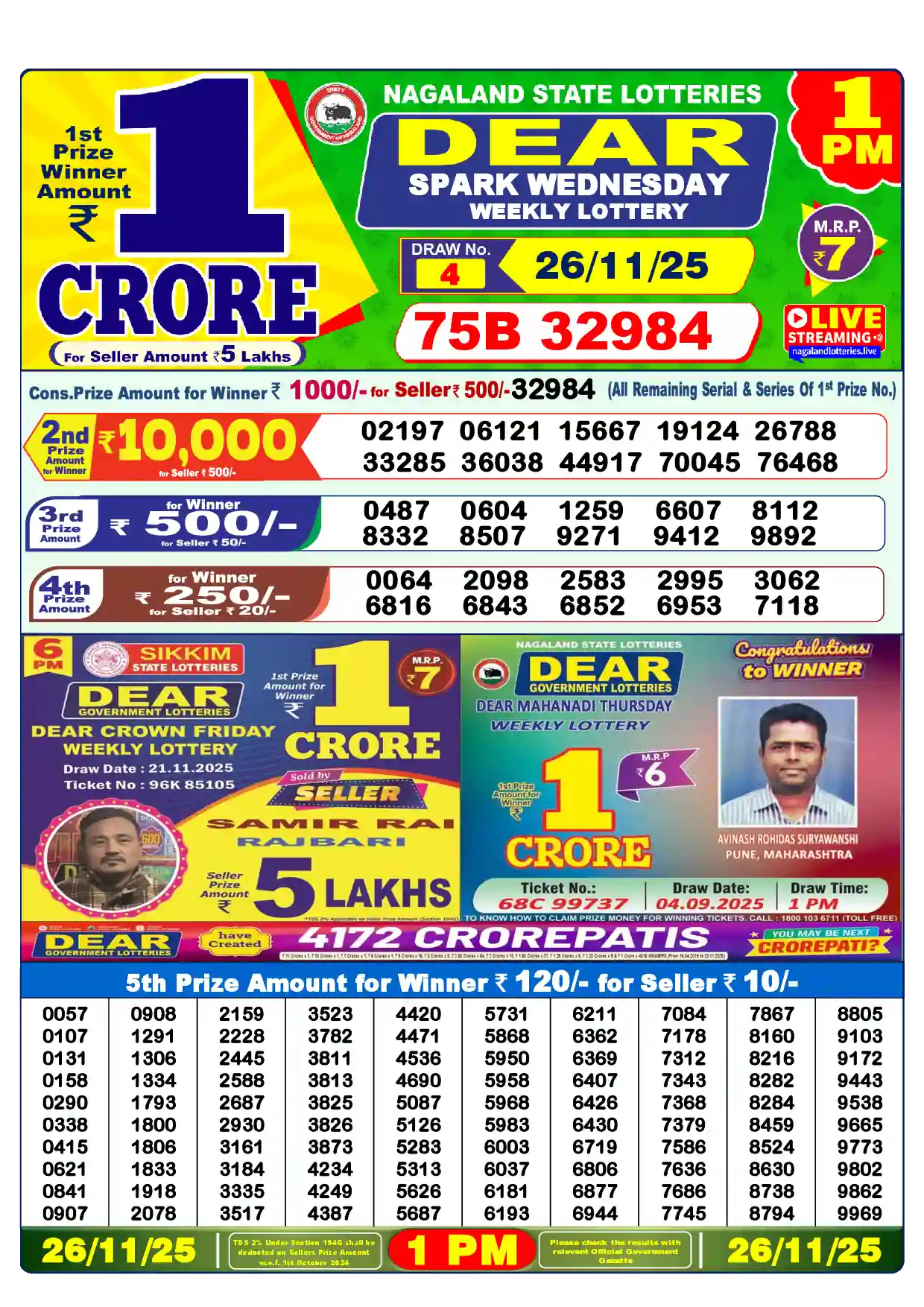 | 5th Prize | 0525, 0538, 0544, 0623, 0659, 0865, 0998, 1178, 1258, 1336, 1465, 1817, 1889, 1939, 2009, 2089, 2104, 2140, 2164, 2505, 2516, 2657, 2722, 2793, 2919, 3197, 3272, 3412, 3538, 3542, 3651, 3693, 3714, 3788, 4104, 4117, 4273, 4308, 4330, 4383, 4470, 4502, 4544, 4631, 4824, 4929, 5005, 5064, 5135, 5162, 5192, 5228, 5265, 5355, 5422, 5509, 5548, 5796, 5856, 6043, 6093, 6163, 6188, 6273, 6282, 6304, 6609, 6681, 6720, 6725, 6980, 7031, 7427, 7439, 7669, 7904, 8160, 8165, 8181, 8208, 8218, 8426, 8465, 8476, 8486, 8716, 8888, 8994, 9073, 9141, 9142, 9303, 9423, 9604, 9639, 9723, 9745, 9849, 9900, 9912 |