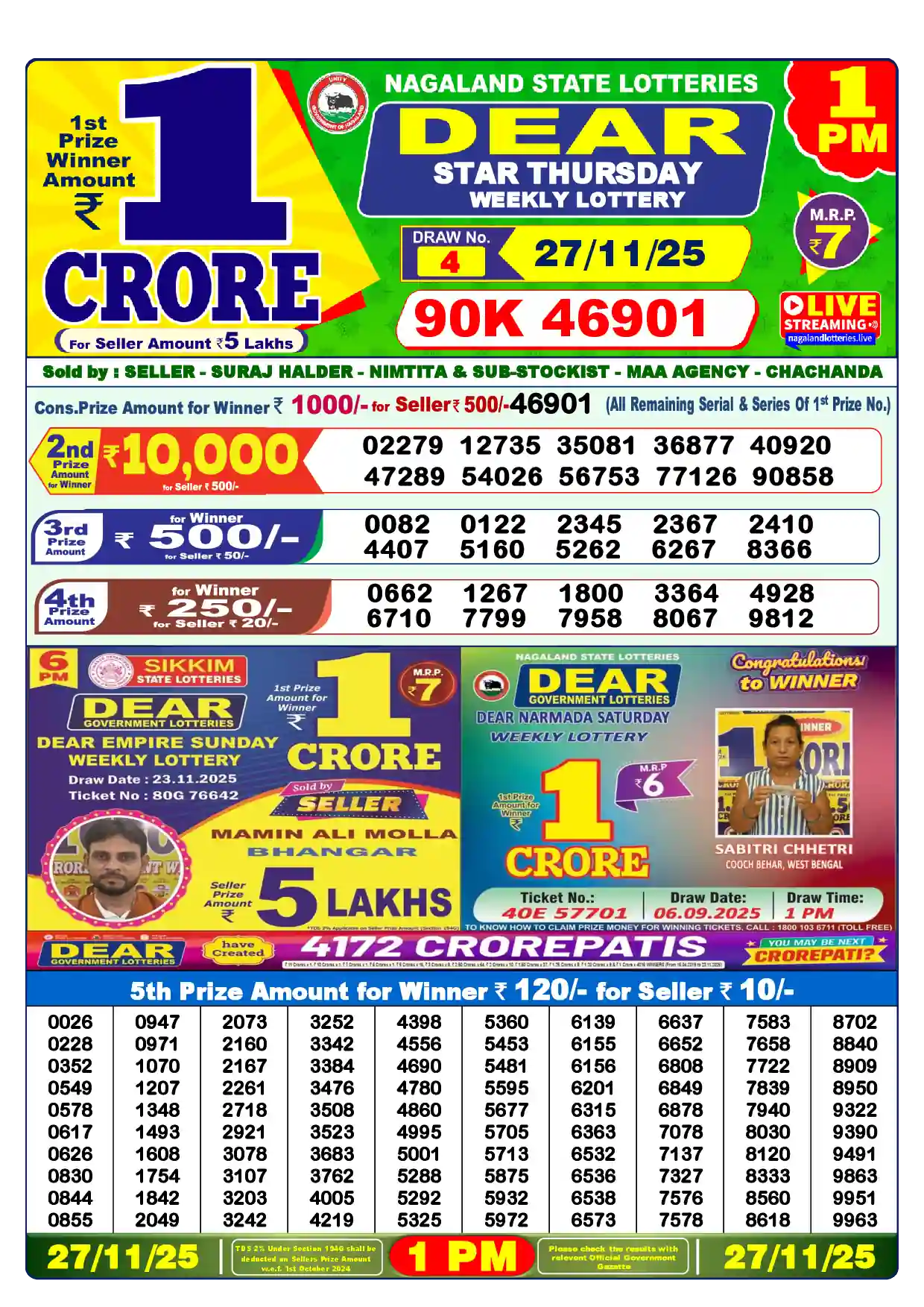 | 5th Prize | 0096, 0141, 0341, 0375, 0446, 0529, 0637, 1039, 1109, 1142, 1161, 1188, 1465, 1517, 1805, 1821, 1843, 1866, 2125, 2132, 2261, 2407, 2499, 2612, 2681, 2915, 3024, 3101, 3161, 3253, 3266, 3660, 3719, 3775, 3851, 4002, 4043, 4123, 4211, 4231, 4434, 4505, 4584, 4655, 4711, 4722, 4797, 4835, 4980, 5132, 5186, 5360, 5366, 5597, 5643, 5749, 5796, 5834, 5899, 6000, 6003, 6050, 6133, 6336, 6474, 6548, 6561, 6632, 6735, 6887, 6900, 7258, 7261, 7326, 7445, 7579, 7654, 7702, 7842, 8052, 8389, 8488, 8502, 8603, 8609, 8621, 8765, 8842, 8926, 9109, 9149, 9192, 9450, 9468, 9508, 9582, 9697, 9773, 9798, 9923 |