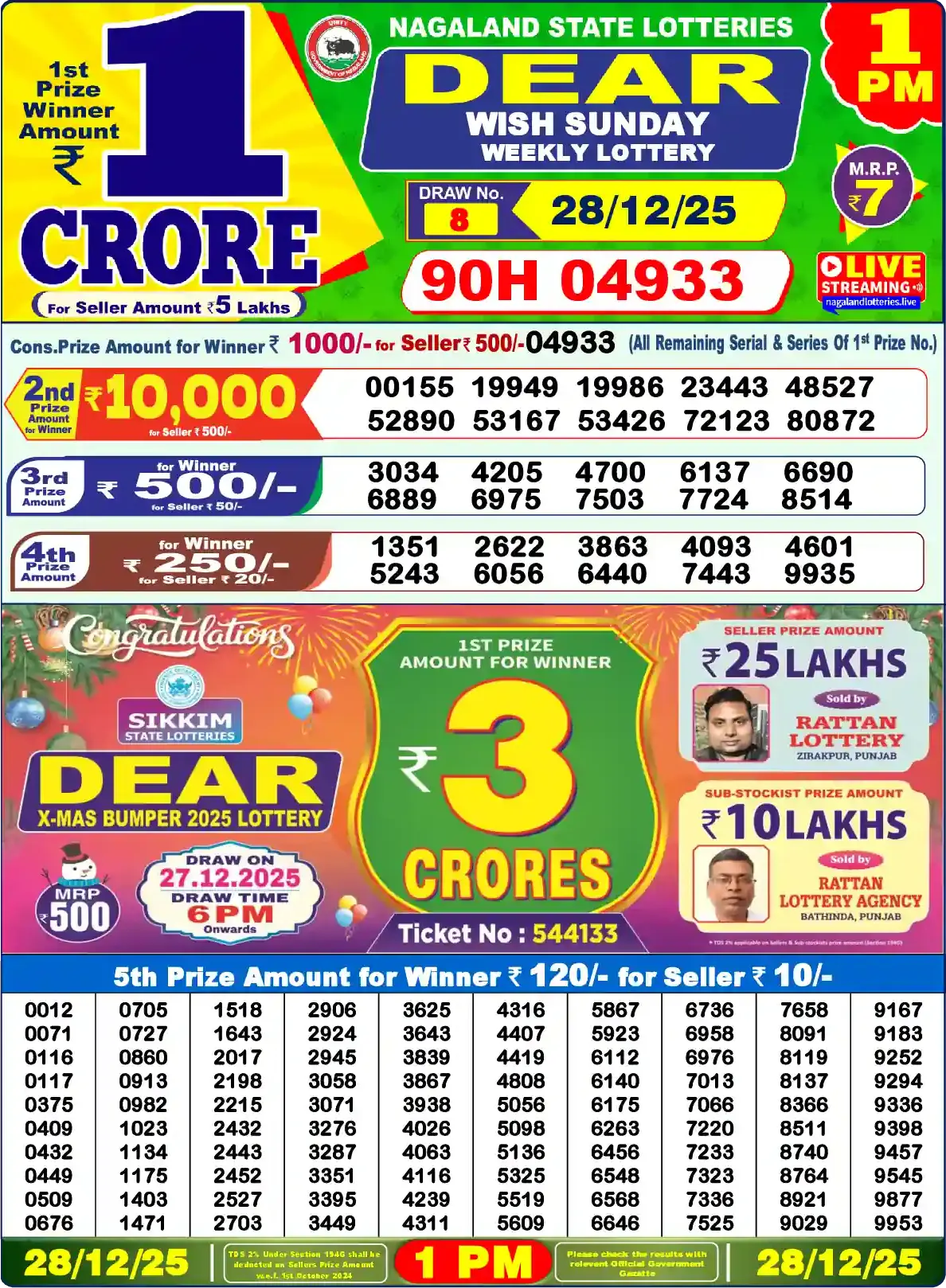 | 5th Prize | 0153, 0227, 0378, 0419, 0424, 0461, 0463, 0614, 0679, 0807, 1029, 1074, 1311, 1355, 1705, 1739, 1815, 1865, 1931, 2083, 2300, 2498, 2527, 2656, 2798, 2876, 2968, 3013, 3141, 3186, 3268, 3316, 3518, 3615, 3616, 3678, 3920, 4047, 4055, 4141, 4293, 4303, 4369, 4454, 4494, 4700, 4762, 4819, 4831, 4978, 5046, 5269, 5272, 5278, 5400, 5775, 5867, 5888, 5963, 6014, 6034, 6119, 6120, 6281, 6367, 6565, 6904, 7038, 7417, 7490, 7553, 7663, 7704, 7705, 7736, 7902, 7987, 8204, 8321, 8332, 8441, 8532, 8557, 8634, 8635, 8708, 8735, 8880, 8907, 9006, 9052, 9314, 9348, 9390, 9401, 9446, 9462, 9467, 9575, 9652 |
