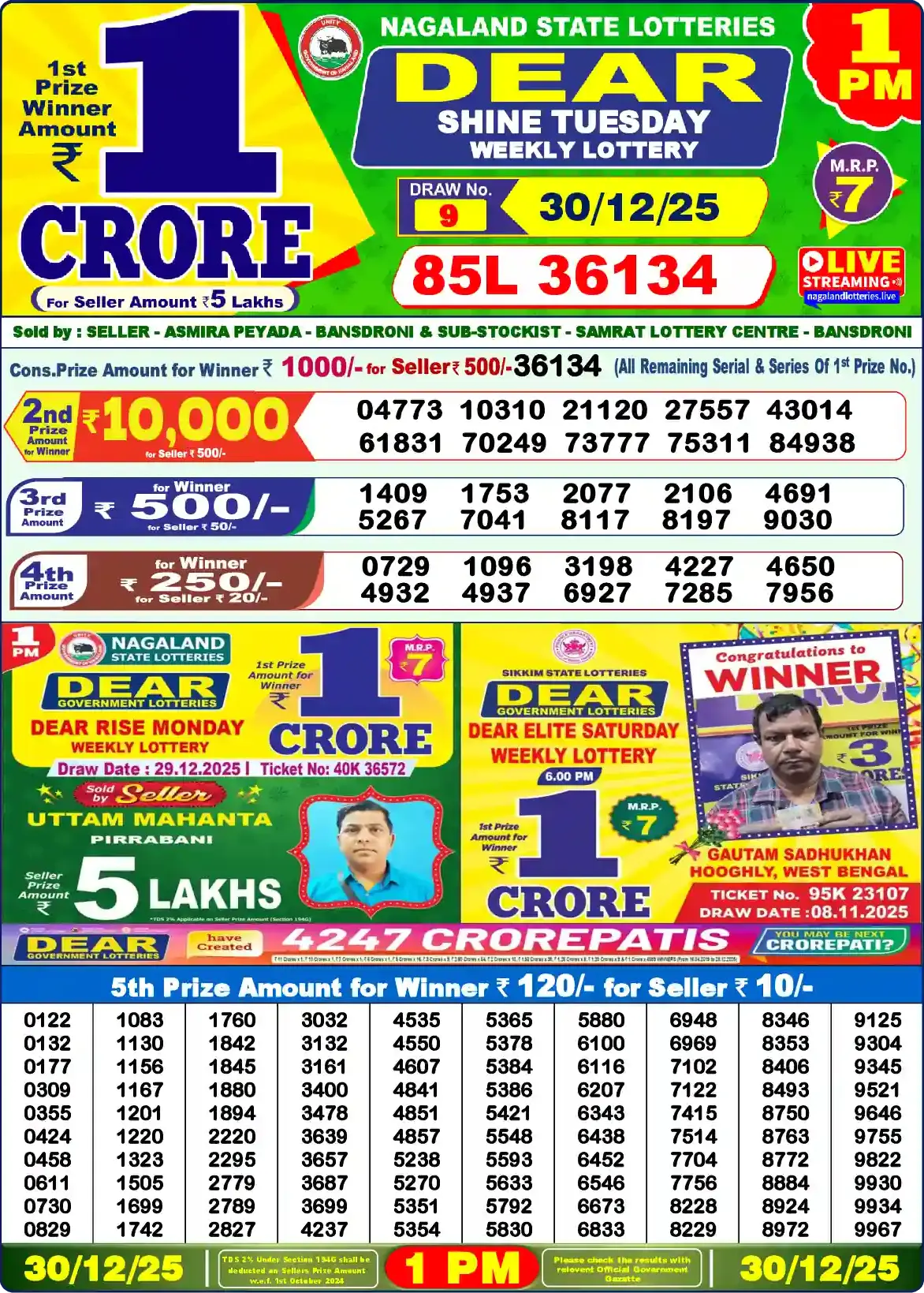 | 5th Prize | 0122, 0132, 0177, 0309, 0355, 0424, 0458, 0611, 0730, 0829, 1083, 1130, 1156, 1167, 1201, 1220, 1323, 1505, 1699, 1742, 1760, 1842, 1845, 1880, 1894, 2220, 2295, 2779, 2789, 2827, 3032, 3132, 3161, 3400, 3478, 3639, 3657, 3687, 3699, 4237, 4535, 4550, 4607, 4841, 4851, 4857, 5238, 5270, 5351, 5354, 5365, 5378, 5384, 5386, 5421, 5548, 5593, 5633, 5792, 5830, 5880, 6100, 6116, 6207, 6343, 6438, 6452, 6546, 6673, 6833, 6948, 6969, 7102, 7122, 7415, 7514, 7704, 7756, 8228, 8229, 8346, 8353, 8406, 8493, 8750, 8763, 8772, 8884, 8924, 8972, 9125, 9304, 9345, 9521, 9646, 9755, 9822, 9930, 9934, 9967 |