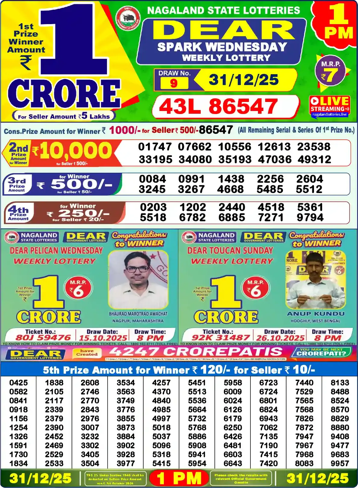 | 5th Prize | 0425, 0582, 0841, 0918, 1156, 1254, 1326, 1591, 1730, 1834, 1838, 2105, 2117, 2339, 2379, 2390, 2452, 2469, 2529, 2533, 2608, 2746, 2770, 2843, 2976, 3007, 3232, 3302, 3405, 3504, 3534, 3563, 3749, 3776, 3855, 3873, 3884, 3902, 3928, 3977, 4257, 4370, 4840, 4985, 4997, 5018, 5037, 5096, 5318, 5415, 5451, 5513, 5536, 5664, 5732, 5768, 5886, 5908, 5941, 5954, 5958, 6009, 6024, 6126, 6179, 6250, 6426, 6481, 6603, 6643, 6723, 6724, 6801, 6824, 6943, 7062, 7135, 7190, 7415, 7420, 7440, 7529, 7565, 7568, 7826, 7872, 7947, 7967, 7968, 8083, 8133, 8488, 8524, 8570, 8829, 8880, 9408, 9477, 9683, 9957 |