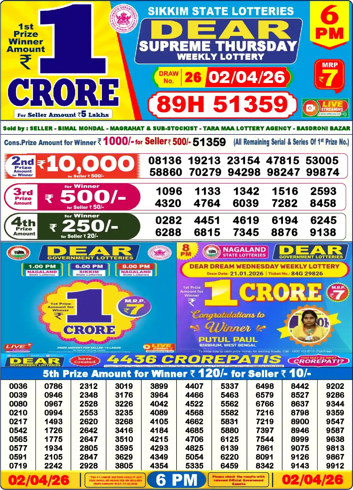 Watch Dear Lottery live draw video + today's results for Sikkim — April 03, 2026.