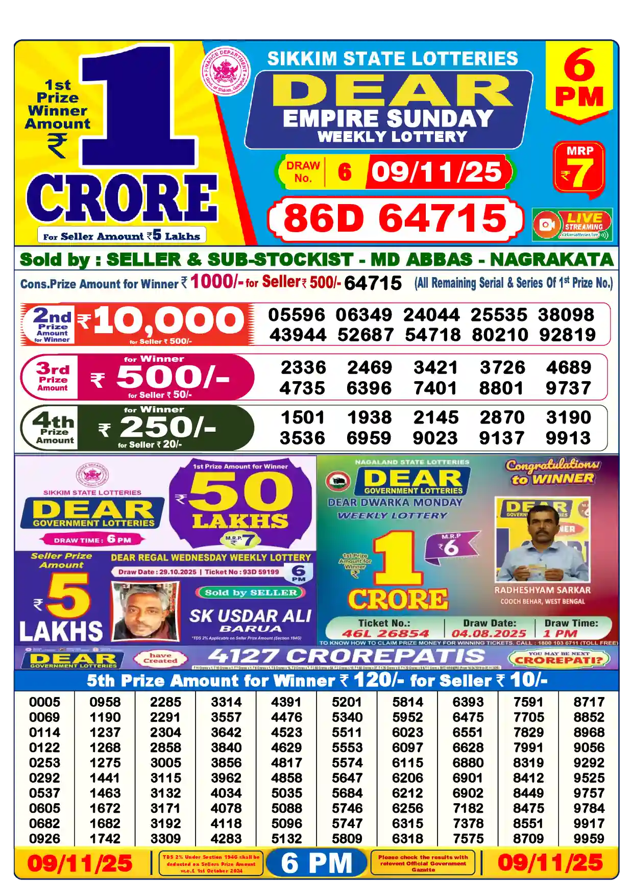 The new results of the Dear Lottery draw will appear on this page automatically at around 6:15 p.m., a few minutes after the live broadcast ends in the state of Sikkim.