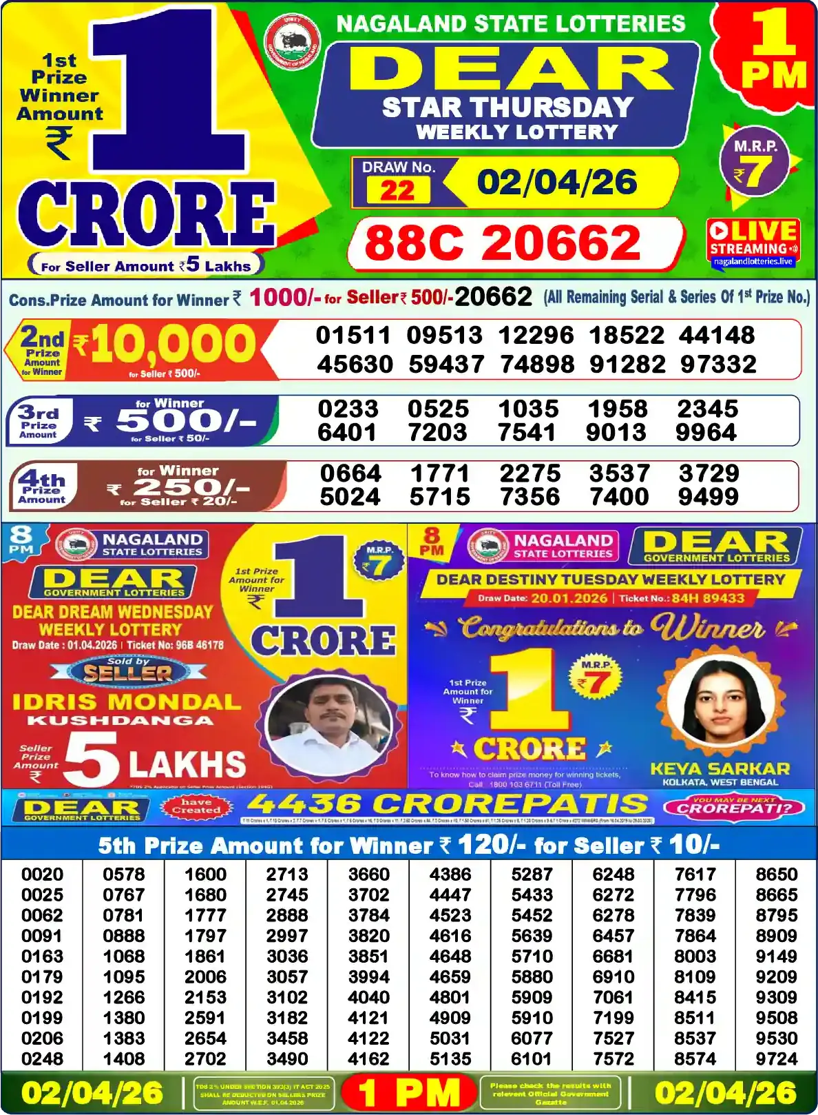 Dear Lottery results yesterday 02/04/2026 from the state of Nagaland at 1:00 p.m. View the Dear Lottery Result Today 1 PM on our website.