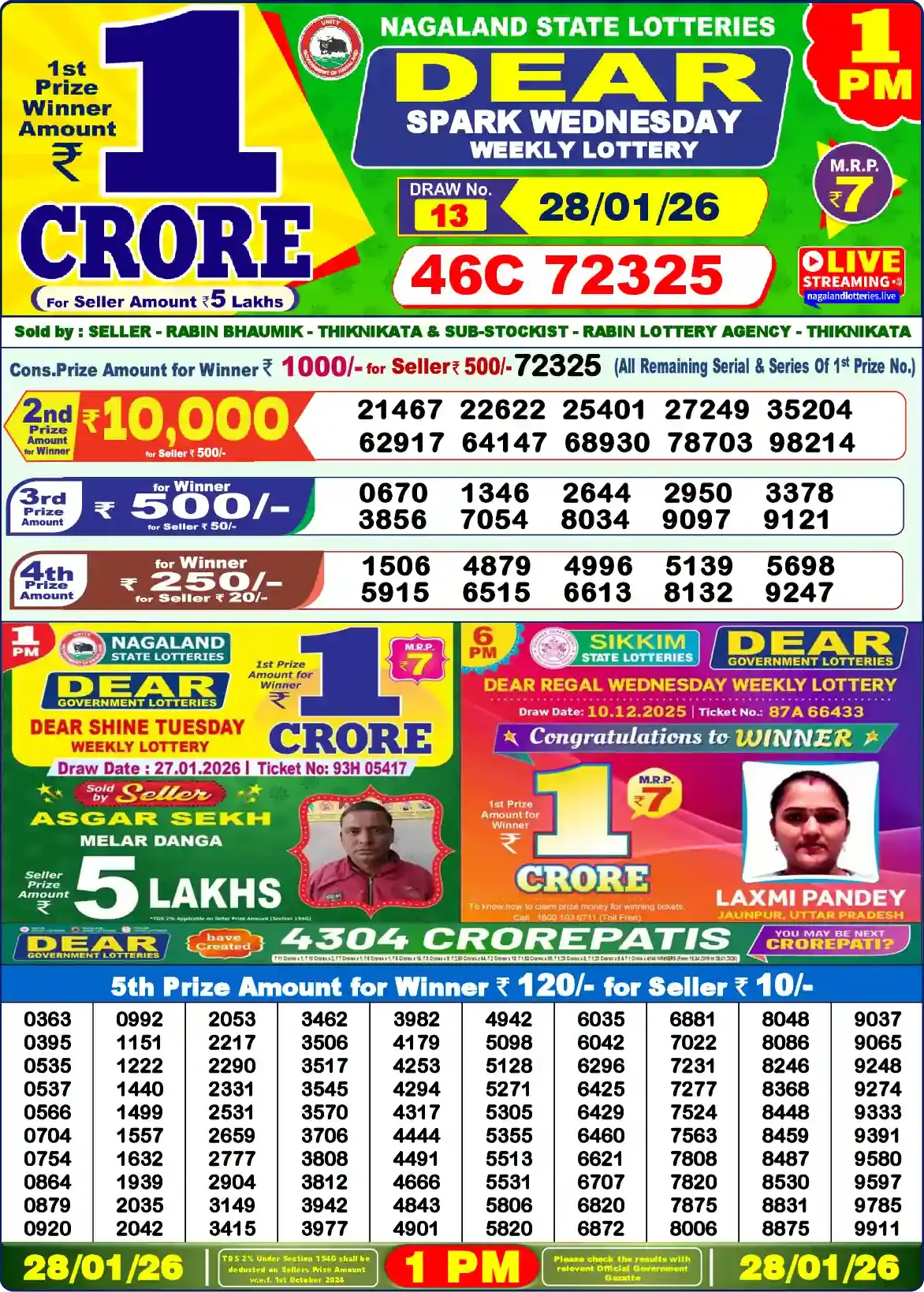 Dear Lottery results yesterday 28/01/2026 from the state of Nagaland at 1:00 p.m. View the Dear Lottery Result Today 1 PM on our website.