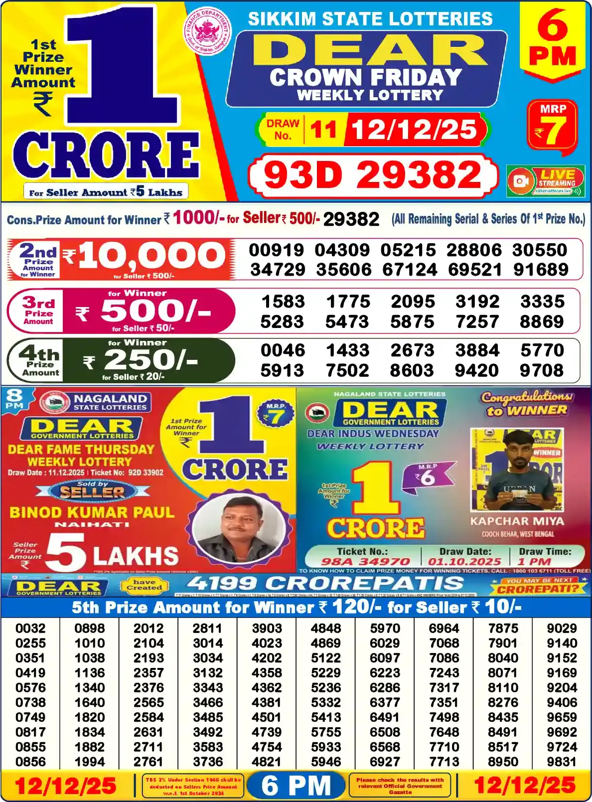 Dear Lottery results yesterday 12/12/2025 from the state of Sikkim at 6:00 p.m. View the Dear Lottery Result Today 6 PM on our website.