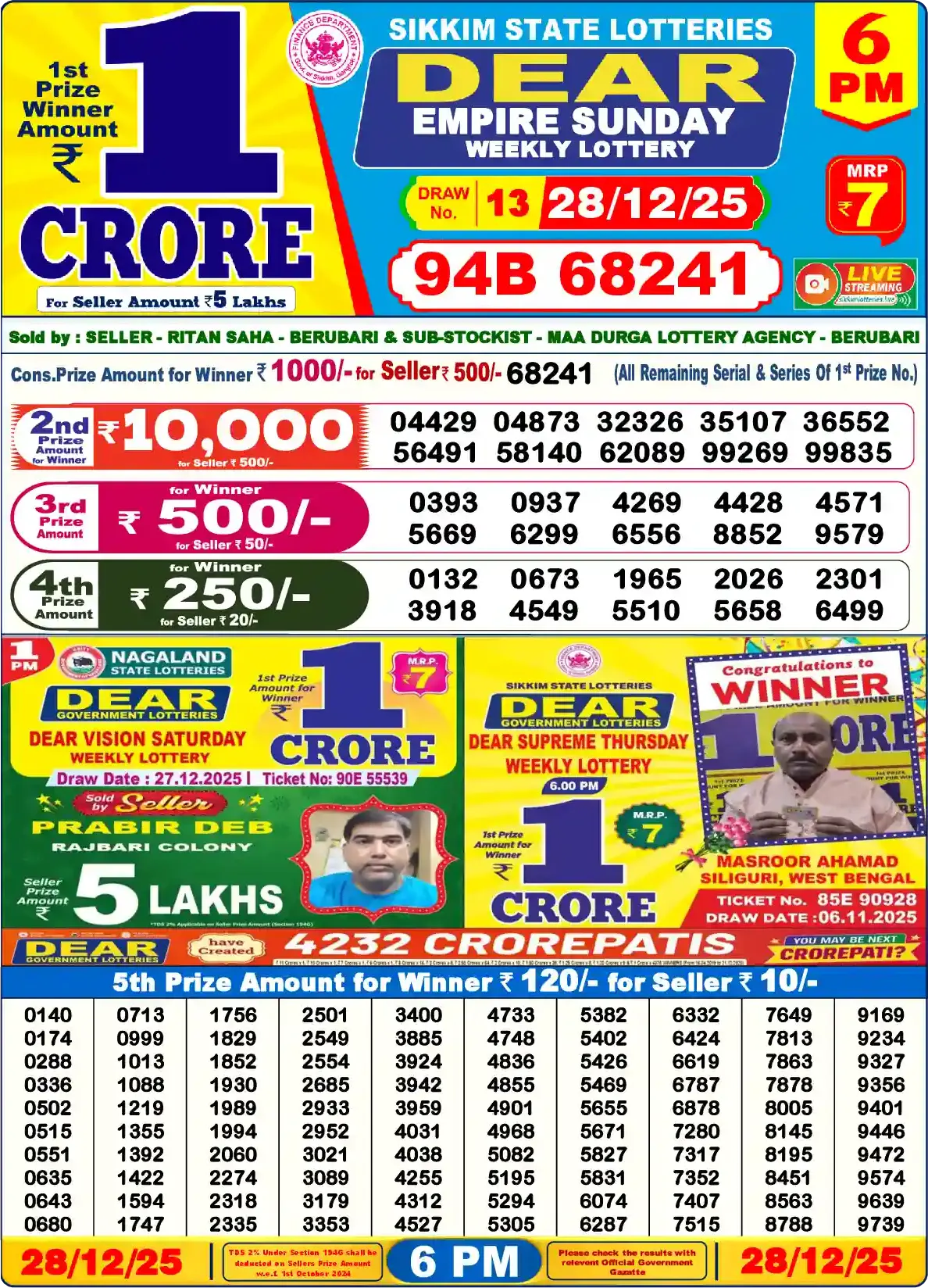 Dear Lottery results yesterday 28/12/2025 from the state of Sikkim at 6:00 p.m. View the Dear Lottery Result Today 6 PM on our website.