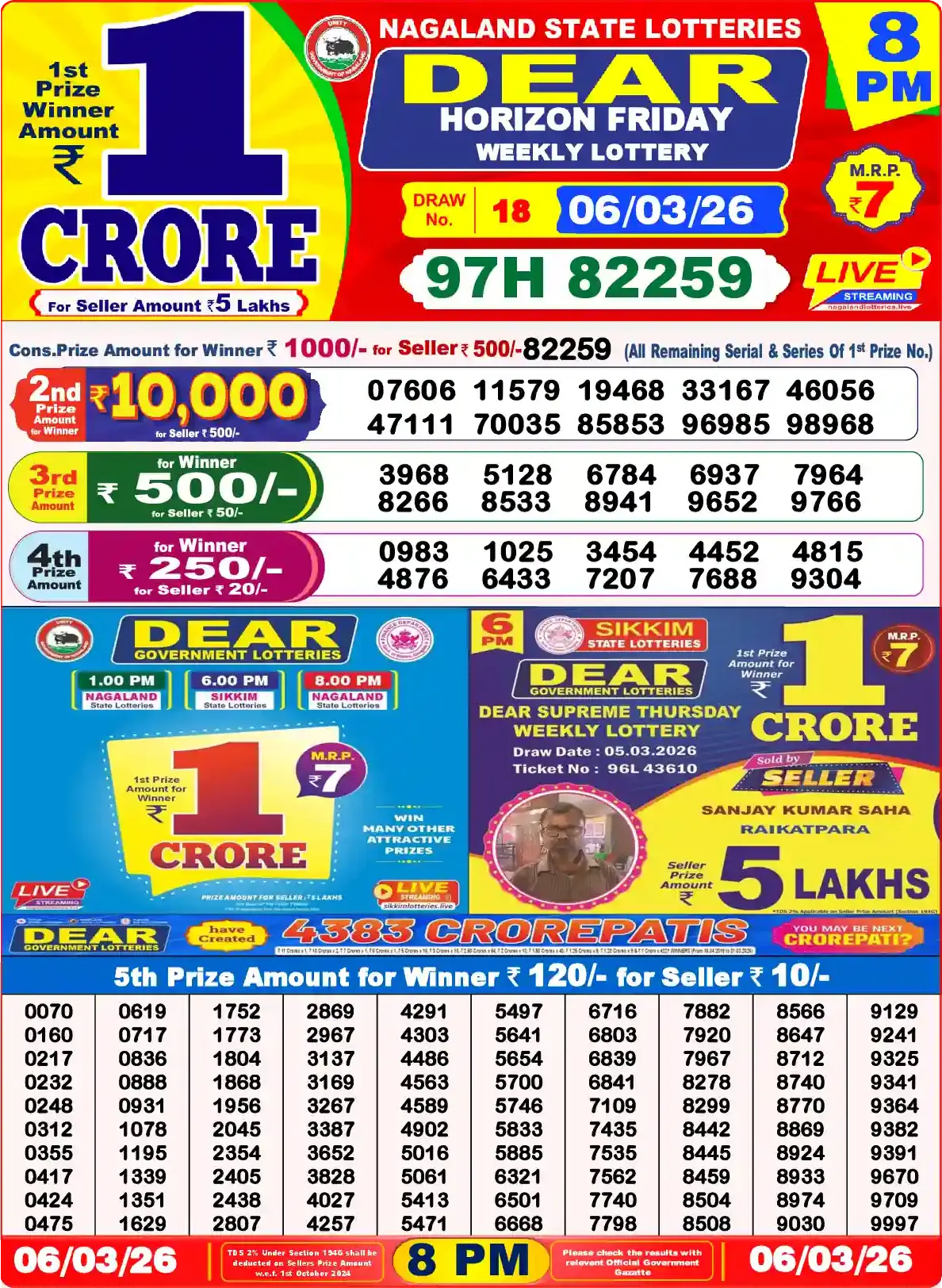 Dear Lottery results yesterday 06/03/2026 from the state of Nagaland at 8:00 p.m. View the Dear Lottery Result Today 8 PM on our website.